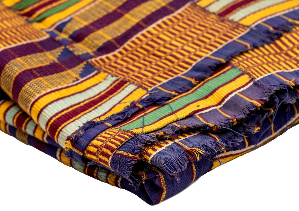 Admire the rich colorful beauty of this authentic vintage Ghanaian Kente Cloth. Woven from cotton, handmade textiles such as this play a central role in the artistic tradition of many West African countries where they are traditionally worn as clothing. Kente cloths are made by the Akan people and were traditionally used solely for royal courts and prestigious occasions. Look carefully and you will see that each piece has its own unique and distinctive pattern. This colorful and vibrant fabric can be used for all kinds of unique design projects. Use it as a table cloth, wall hanging, to make custom clothes, or simply as a colorful accent for your favorite room. This cloth measures approximately 40-44 x 71-75" and is one of a kind. You will receive the exact cloth shown in the photograph!