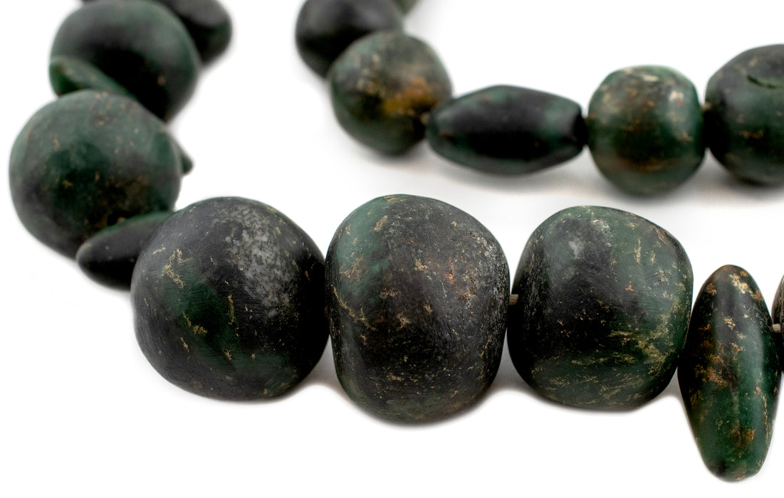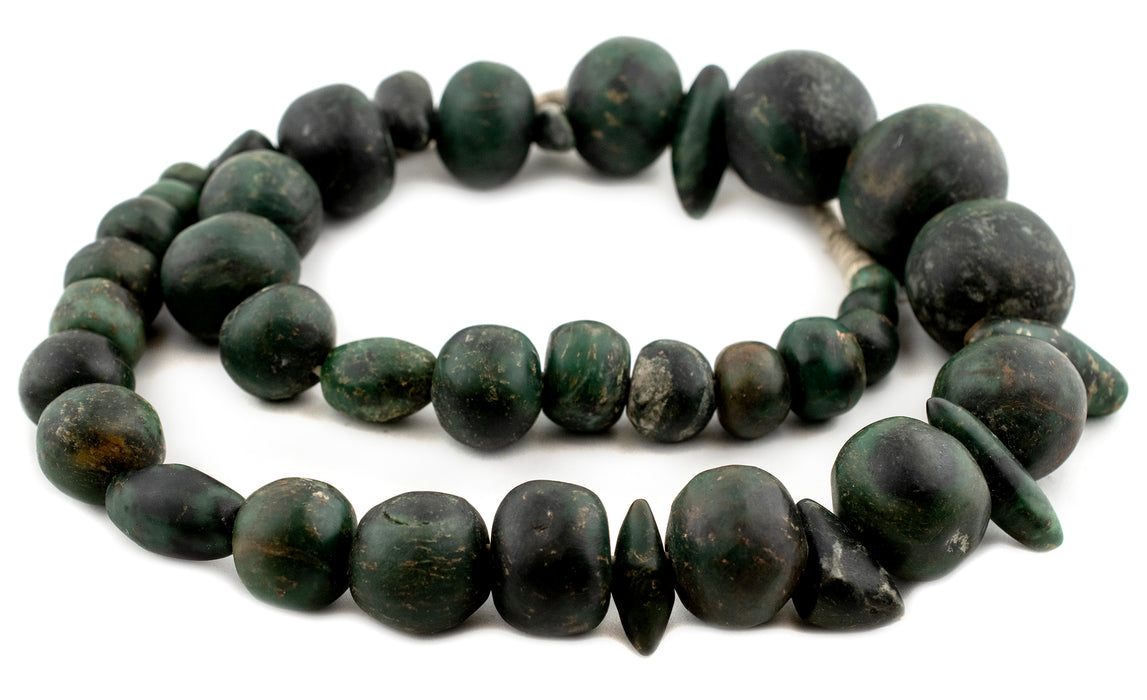 Admire this beautiful strand of Serpentine Stone Beads from Mali West Africa. Beads such as these have been prized for their unique color since Neolithic times. While the exact age of the Serpentine beads is not precisely known, similar beads from both Mauritania and Mali have been dated to more than 2000+ years old. Look carefully and you will see the unique handmade character of these stone beads. This is an exceptional one-of-a-kind piece suitable for bead collectors and bead aficionados alike! Only one strand available. You will receive the exact strand pictured. Measurements are approximations.