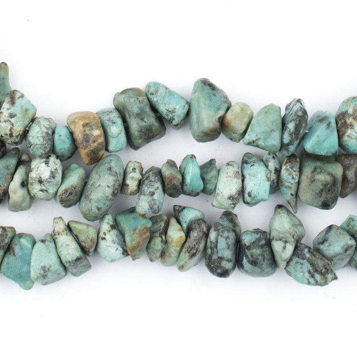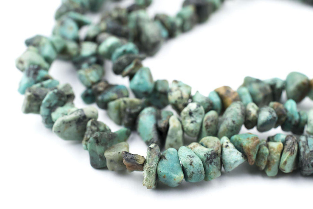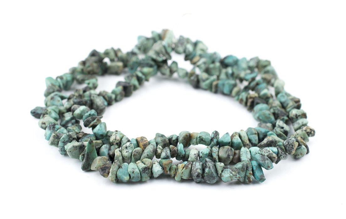 Check out this amazing strand of stone beads made from "African turquoise", which is sourced from African jasper mines. This brilliant and unique color will add an unmistakable accent to your jewelry designs. These beads are cut and polished in a natural chip shape.