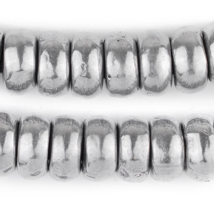 These tribal aluminum beads are made in a design traditional to the Mursi people. The Mursi are a pastoralist tribe who live in various parts of Ethiopia, and are known for their unique and pronounced jewelry designs. Aluminum is a common choice for jewelry designers because it is lighter in weight and known to resist rust, while still resembling genuine silver. Each bead measures approximately 8 x 16mm with a hole size of approximately 6mm. You will receive a full strand measuring 24" long. Incorporate these beads into your next design!