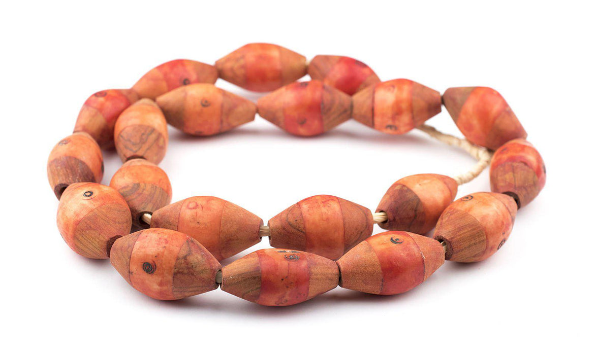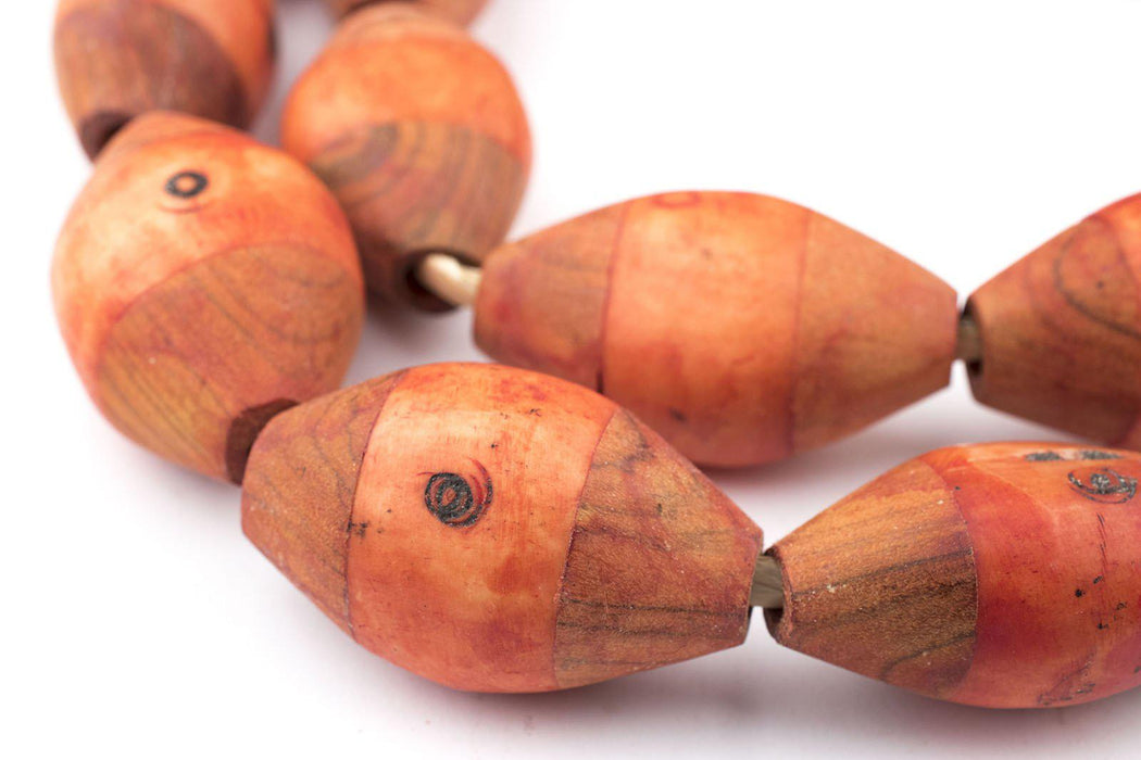 Here we have a truly unique style of African bone beads. These special trade beads are hand carved and patterned with a traditional eye design. Each bead is then capped on both ends using pruned wood.