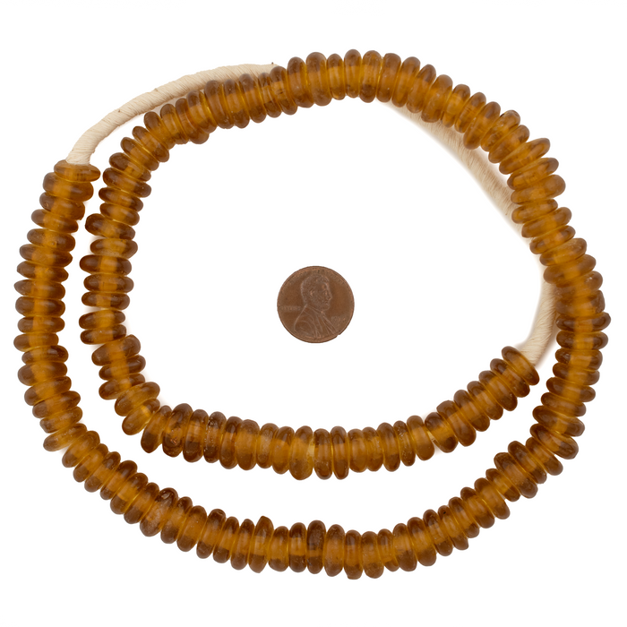 Take a look at these beautiful rondelle shaped recycled glass beads. Powder glass beads are made by crushing glass to a fine powder and heating it so that the particles fuse together. The glass is then poured into clay molds, with a cassava leaf stem used to make the hole. They are baked in an oven and the glass fuses and the cassava stem burns up. This technique has been used in Africa for centuries.