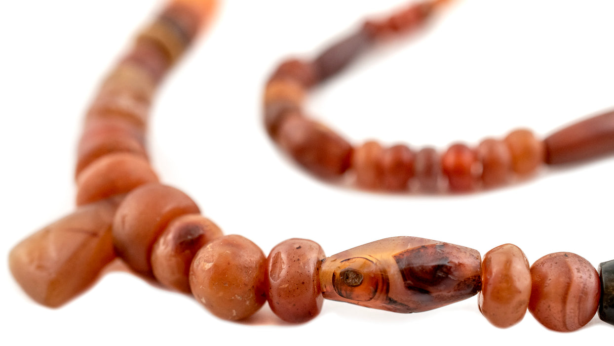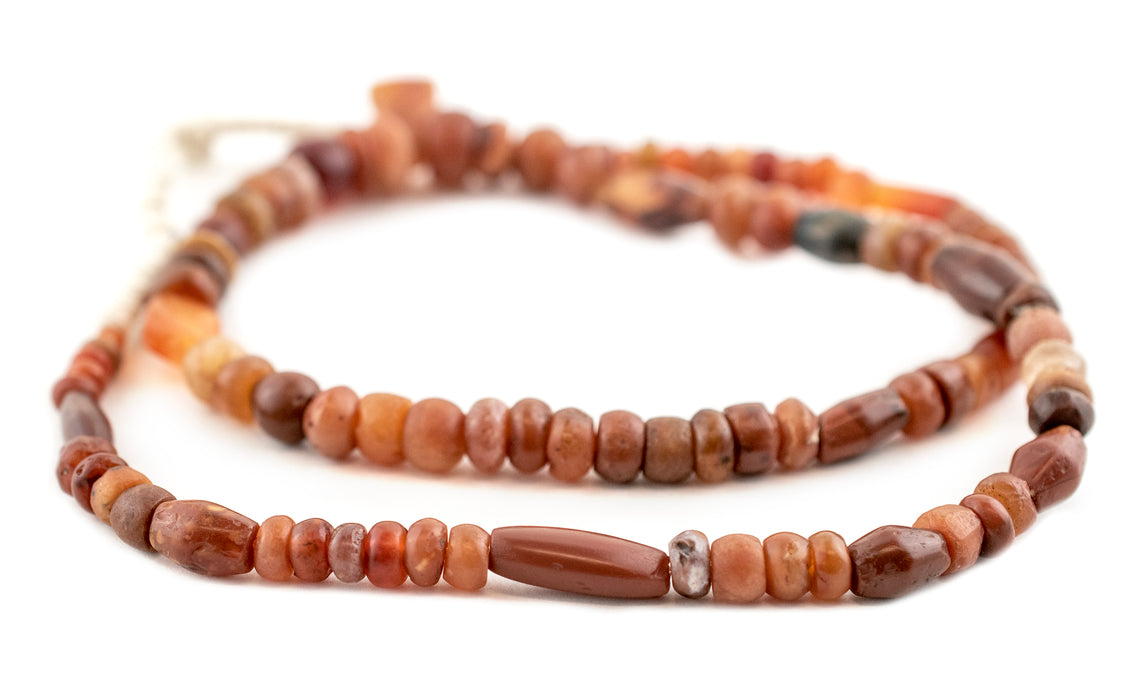 These old stone beads are both colorful and unusual. Natural stone was among the earliest materials used by ancient cultures to make beads for personal adornment. Beads such as these are discovered in the ground where they have sometimes laid undisturbed for hundreds if not thousands of years. These specific beads were found in Mali West Africa. Each graduated strand will consist of a unique assortment of sizes and shapes. These beads are truly one of a kind! You will receive the exact strand pictured. Note that while the material is said to be of old, possibly ancient origin, the precise age of the beads has not been independently verified.