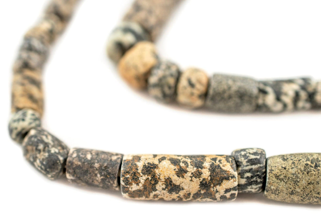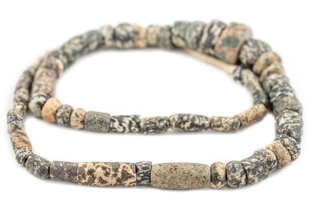 These unusual stone beads are said to be hundreds of years old. Each bead has been individually shaped from granite stone and arranged nicely as a graduated strand. Old stone beads such as these are found in the shifting sands of Mali, a country that borders the great Saharan Desert. Ancient Malian cities such as Djenne and Timbuktu have gained an almost fabled status due to their importance for hundreds of years as important centers of learning and trade. Each exceptionally long strand of Mali Granite beads measures almost 40" in length. These unique beads are suitable for collectors, bead connoisseurs, or jewelry designers with a discerning eye. You will receive the exact strand pictured. No two strands are alike. Each bead measures approximately 5-44 x 4-16mm, with a hole size of approximately 1-2mm. You will receive one strand measuring approximately 30". There are around 50 beads on each strand.