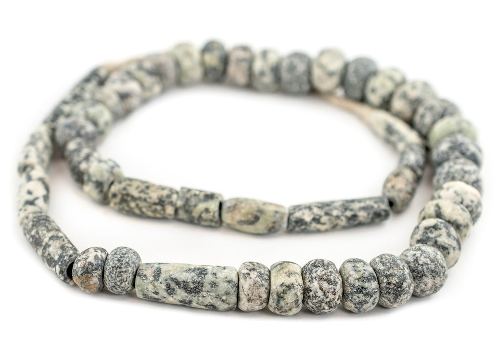 These unusual stone beads are said to be hundreds of years old. Each bead has been individually shaped from granite stone and arranged nicely as a graduated strand. Old stone beads such as these are found in the shifting sands of Mali, a country that borders the great Saharan Desert. Ancient Malian cities such as Djenne and Timbuktu have gained an almost fabled status due to their importance for hundreds of years as important centers of learning and trade. Each exceptionally long strand of Mali Granite beads measures almost 40" in length. These unique beads are suitable for collectors, bead connoisseurs, or jewelry designers with a discerning eye. You will receive the exact strand pictured. No two strands are alike. Each bead measures approximately 5-44 x 4-16mm, with a hole size of approximately 1-2mm. You will receive one strand measuring approximately 30". There are around 50 beads on each strand.