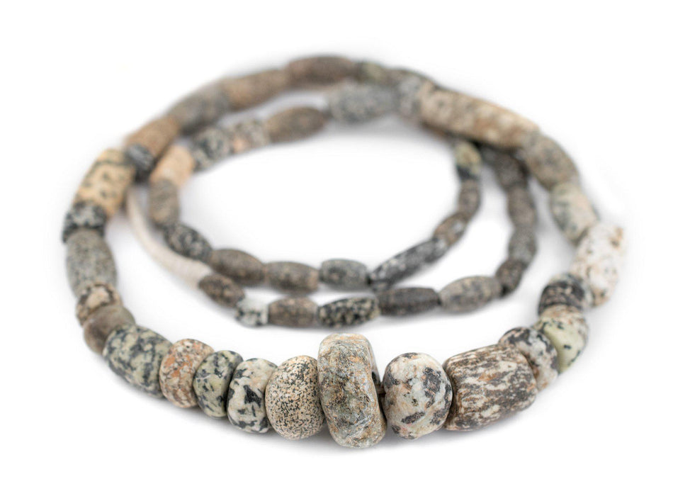 These unusual stone beads are said to be hundreds of years old. Each bead has been individually shaped from granite stone and arranged nicely as a graduated strand. Old stone beads such as these are found in the shifting sands of Mali, a country that borders the great Saharan Desert. Ancient Malian cities such as Djenne and Timbuktu have gained an almost fabled status due to their importance for hundreds of years as important centers of learning and trade. Each exceptionally long strand of Mali Granite beads measures almost 40" in length. These unique beads are suitable for collectors, bead connoisseurs, or jewelry designers with a discerning eye. You will receive the exact strand pictured. No two strands are alike.