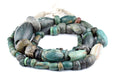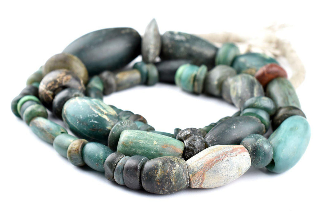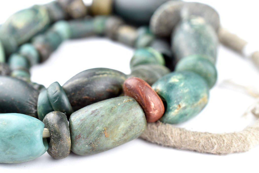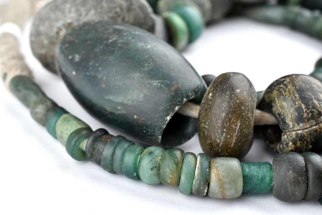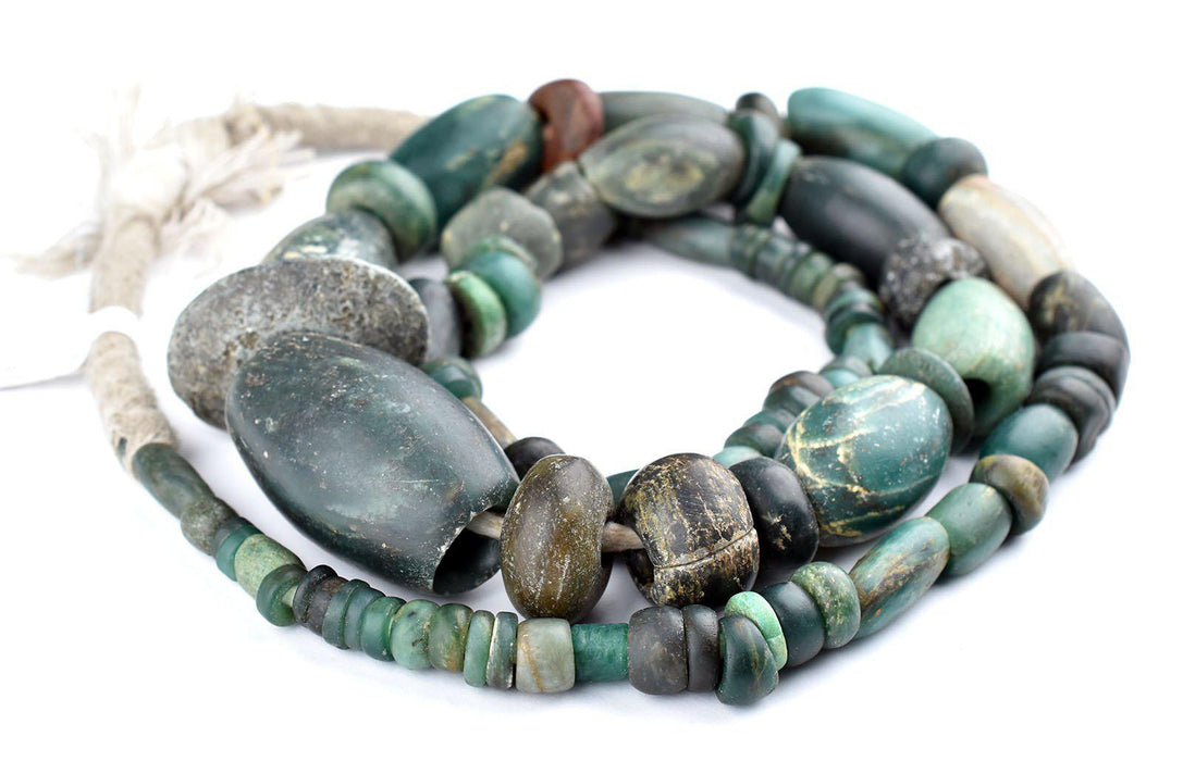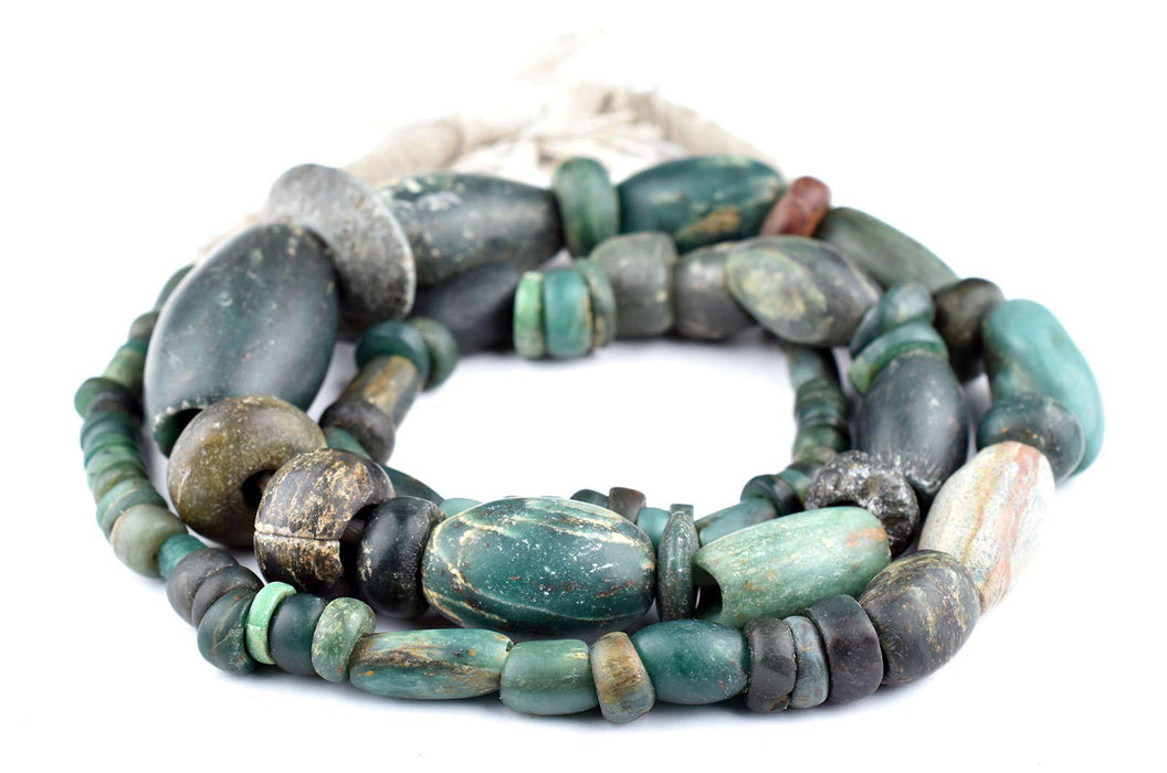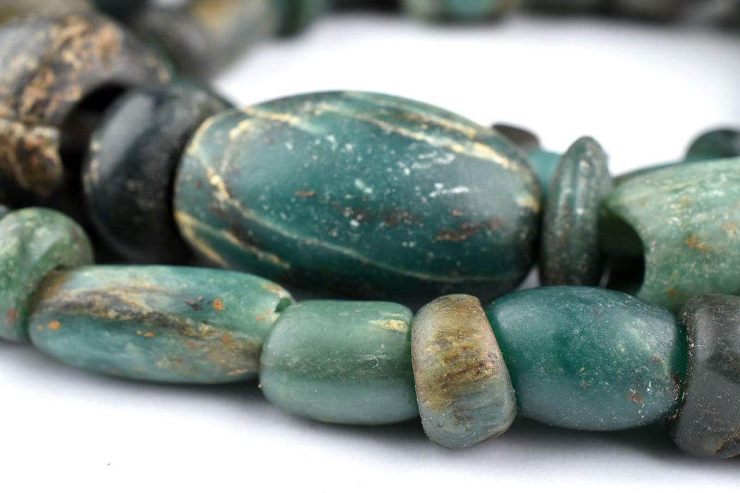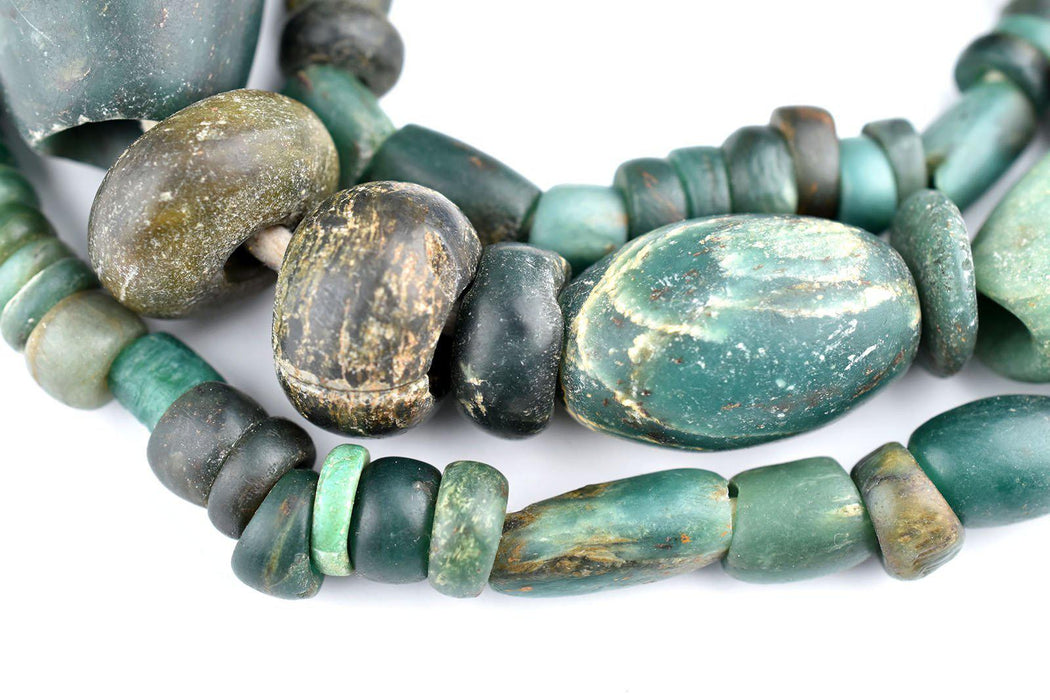 Take a look at this incredible strand of ancient Serpentine stone beads. The rich deep green color and lustrous texture of these beads make them among the rarest of African beads. Hewn by hand and polished to perfection, these incredible beads are said to be of Neolithic origin and have as much as 2000+ years of age. Beads such as these are hard to find but occasionally turn up in West Africa where they are prized by collectors and bead connoisseurs alike. Own an authentic piece of bead history. This unique strand includes beads in a variety of shapes and shades. You will receive the exact strand pictured. Only one strand available.