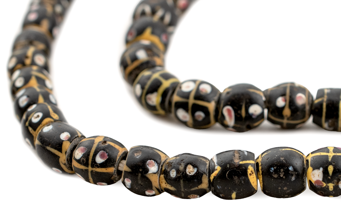 These stunning antique eye beads feature the iconic French cross design on a deep black glass base — a hallmark of Venetian bead artistry. Handcrafted in Murano, Italy during the late 19th to early 20th century, these beads were once traded across Africa and beyond, prized for their beauty and craftsmanship.