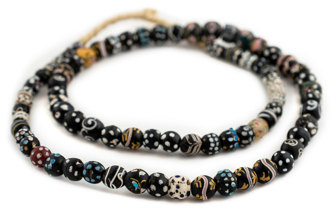 Handcrafted in Murano, Italy during the late 19th to early 20th century, these beads represent some of the finest examples of Venetian bead artistry made for the African trade. Each bead showcases vibrant millefiori-style detailing layered over deep black glass, creating a bold and timeless visual impact.