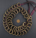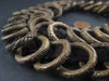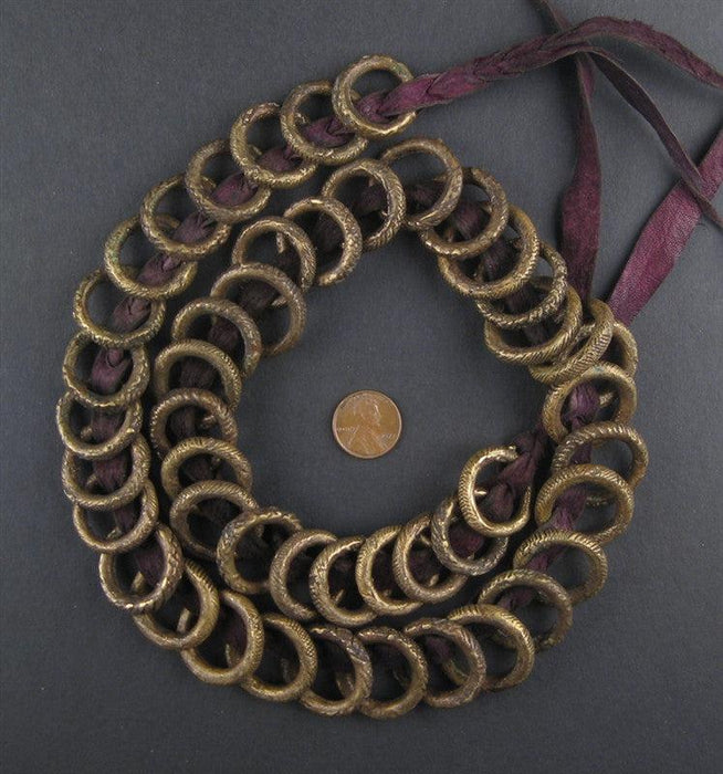 This antique money belt was once intended to be used as currency for commerce. The brass rings have been woven into a leather strip but may be easily removed. Each bead measures approximately 26mm in diameter. Each belt is unique and may vary slightly from photo with between 35-40 rings. Leather binding may vary in color from brown to red. Please inquire in advance if you have special requirements.