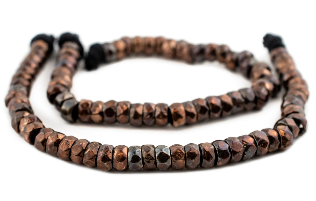 These faceted cylinder beads have a modern and fresh feel. The special antique copper finish nicely reflects various copper tones. Each 9" strand has about 50 beads measuring 4mm wide by 8mm diameter. This artisan product is made using premium copper electroplating over brass to make this copper finish a customer favorite. Try a strand today!