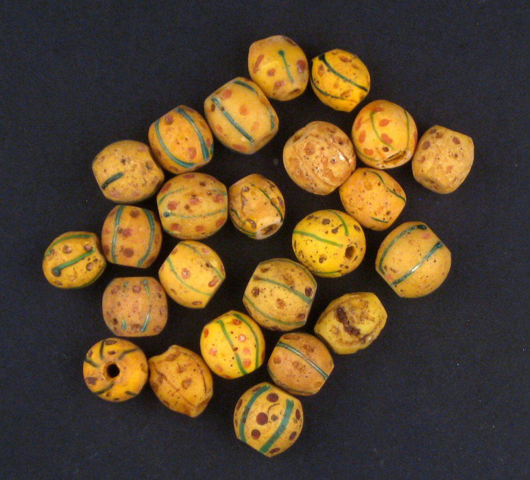 Beautiful old ethiopian yellow trade beads. These beads have traveled at least three continents and were originally traded in the 1800's. Each bead is unique and may vary in condition, color, pattern of dots, and size. Your beads will be selected randomly from our collection. Some beads may have chips or scratches due to age. Own a piece of history with these amazing beads. Hard to find.