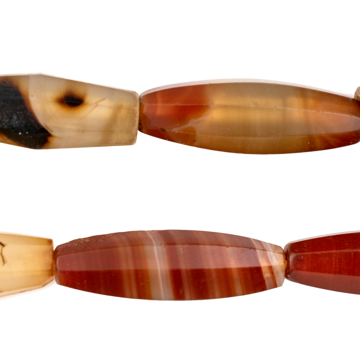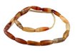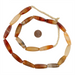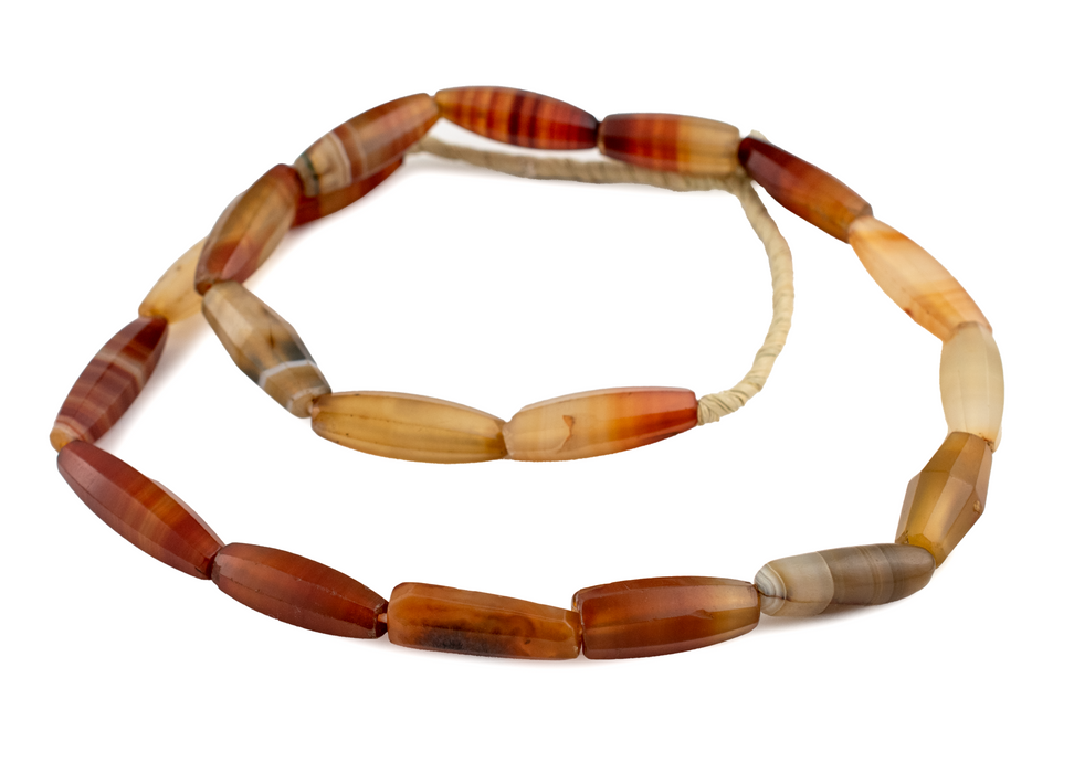 Commonly referred to by their place of production, Idar Oberstein Beads carry to this day a reputation for quality craftsmanship. Idar Oberstein in West Germany rose to prominence during the early 19th century as a significant site for stone-cutting and bead-making. By the 1860s at least 56 stone mills were operating along the river Nahe. Skilled craftsman cut and polished stones imported from Brazil and other places to produce distinctive designs for trade in West Africa and other places. These beads have been highly sought after due to their unique shape and colors and are coveted by collectors and bead connoisseur alike. Each unique strand measures approximately 28" in length and consists of a unique assembly of beads. Some beads may be chipped or broken due to age. You will receive the exact strand pictured.