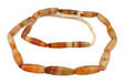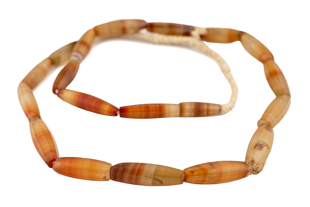 Commonly referred to by their place of production, Idar Oberstein Beads carry to this day a reputation for quality craftsmanship. Idar Oberstein in West Germany rose to prominence during the early 19th century as a significant site for stone-cutting and bead-making. By the 1860s at least 56 stone mills were operating along the river Nahe. Skilled craftsman cut and polished stones imported from Brazil and other places to produce distinctive designs for trade in West Africa and other places. These beads have been highly sought after due to their unique shape and colors and are coveted by collectors and bead connoisseur alike. Each unique strand measures approximately 28" in length and consists of a unique assembly of beads. Some beads may be chipped or broken due to age. You will receive the exact strand pictured.