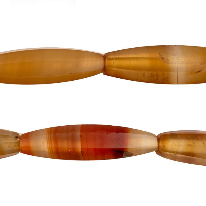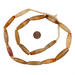 Commonly referred to by their place of production, Idar Oberstein Beads carry to this day a reputation for quality craftsmanship. Idar Oberstein in West Germany rose to prominence during the early 19th century as a significant site for stone-cutting and bead-making. By the 1860s at least 56 stone mills were operating along the river Nahe. Skilled craftsman cut and polished stones imported from Brazil and other places to produce distinctive designs for trade in West Africa and other places. These beads have been highly sought after due to their unique shape and colors and are coveted by collectors and bead connoisseur alike. Each unique strand measures approximately 28" in length and consists of a unique assembly of beads. Some beads may be chipped or broken due to age. You will receive the exact strand pictured.