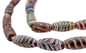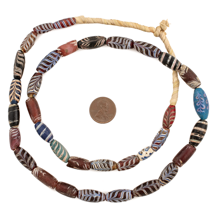 Feather beads are recognizable by the distinctive symmetric motif that resembles the feather of a bird. This design was created by a skilled artisan using colored glass on the surface of the bead. While the exact origins of the feather design is not known, it is believed to be quite old and is also found on some more ancient beads from the Roman and Islamic period. In fact, these may be the inspiration for the designs that was produced in the workshops of Venice during the late 18th and early 19th centuries. This unique strand is comprised of approximately 34 beads measuring 14-20 x 8mm and 26" in length. A nice mix of different color feather beads are represented on this strand including more rare varieties such as blue, aqua, and black. You will receive the exact strand pictured. Only one available!