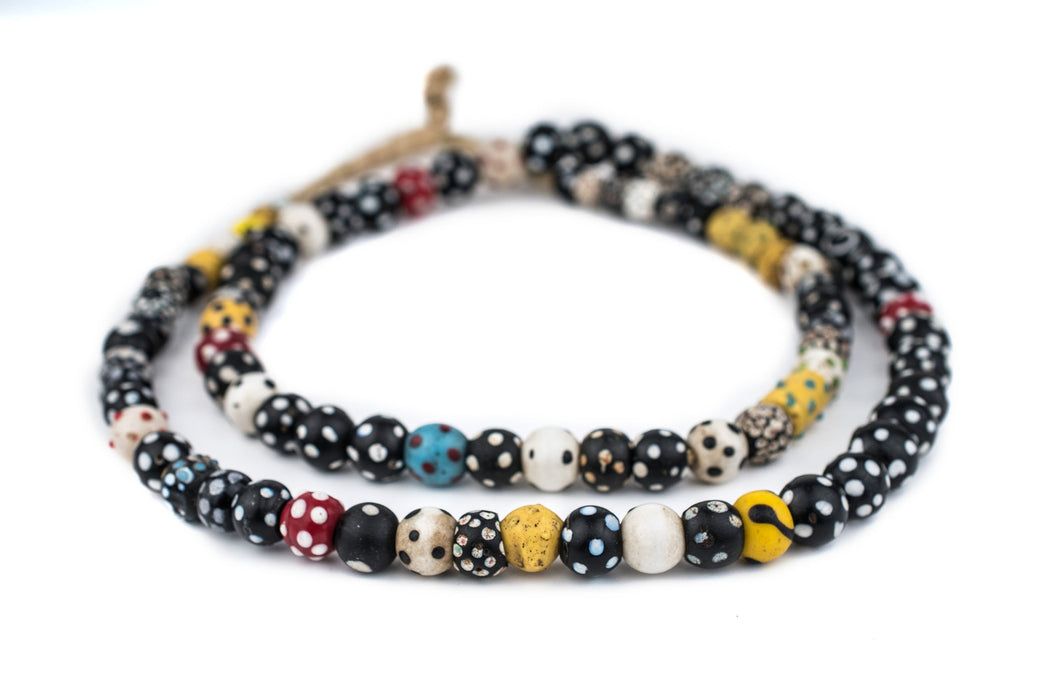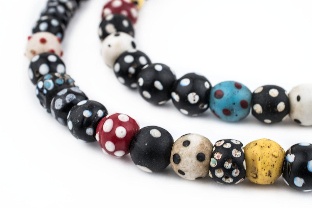 These exceptional Skunk Eye beads are a beauty to behold. Old trade beads such as these originate in Venice, Italy where they were produced and sent to Africa. Each bead has been crafted by an artisan by applying the molten glass dots to the base of the bead. Skunk beads are found in a number of different variants both in East Africa as well as West Africa in countries such as Ethiopia, Ghana, and Nigeria. While they are common in black and red colors, this strand includes some ultra rare varieties including yellow, white, and blue. These particular beads are in relatively good condition. Individual beads measure approximately 9-11 x 10-12mm in diameter with about 84 beads on the strand. You will receive the exact strand pictured.