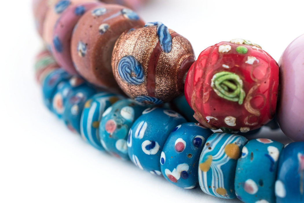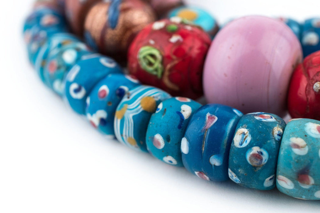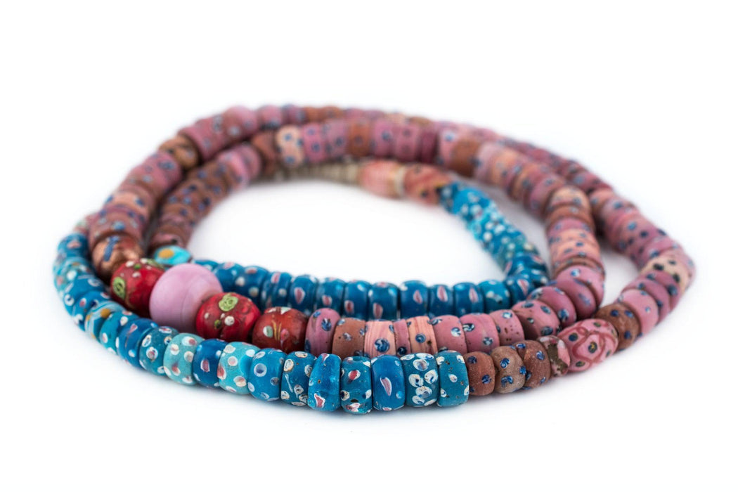 Take a moment to admire this exceptional strand of rare Antique Venetian Trade Beads. Coveted by collectors and discerning bead connoisseurs alike, these hard-to-find Pink and Blue Pineapple Beads are identified as such due to their unique and distinctive color and dotted design. These authentic African Trade Beads can be found in one of several shapes including elongated ovals, disk-shaped, and round beads. This long strand includes representative beads in all three shapes and measures 40" in length. Individual beads measure approximately 3-13 x 9-17mm. This is a unique strand and you will receive the exact strand pictured. Some beads will show small chips or wear due to age. Don't miss this opportunity to own this truly special strand!