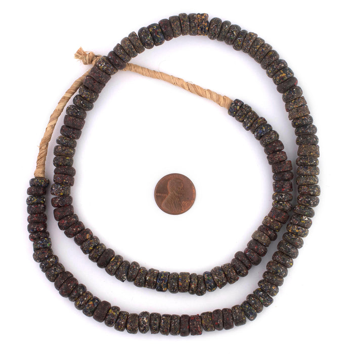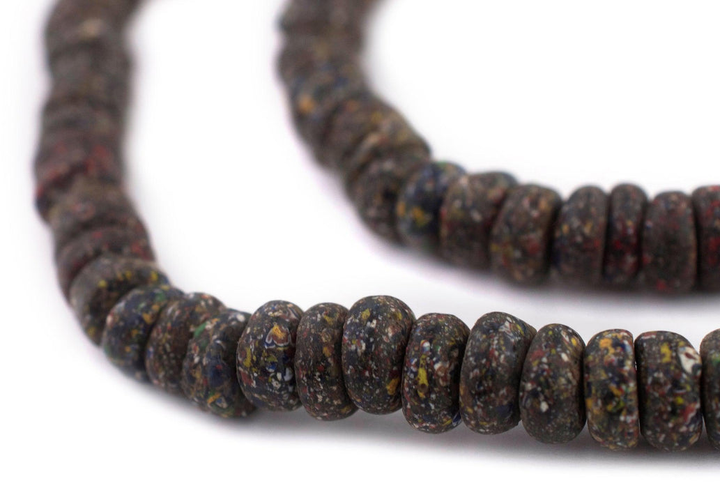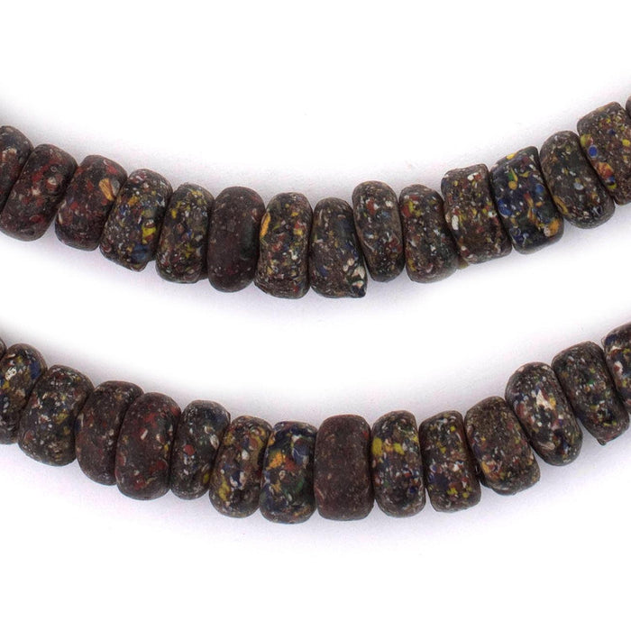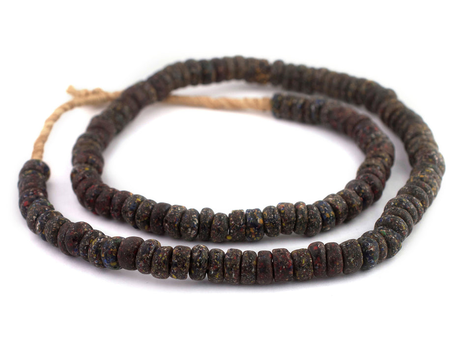 Take a look at this hard to find strand of "End of Day Beads" from Ghana in West Africa. Beads such as this are made by recycling older broken beads and fusing the glass into a new form. Look carefully and you will see bits of Venetian Millefiore and other interesting finds in the detail of these beads. Each strand is unique and may vary slightly from photo.