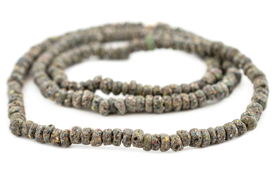 Take a look at this hard to find strand of "End of Day Beads" from Ghana in West Africa. Beads such as this are made by recycling older broken beads and fusing the glass into a new form. Look carefully and you will see bits of Venetian Millefiore and other interesting finds in the detail of these beads. Each bead measures approximately 3-5 x 8mm with a hole size of approximately 2mm. You will receive a full strand measuring approximately 34". You will receive the exact strand pictured.