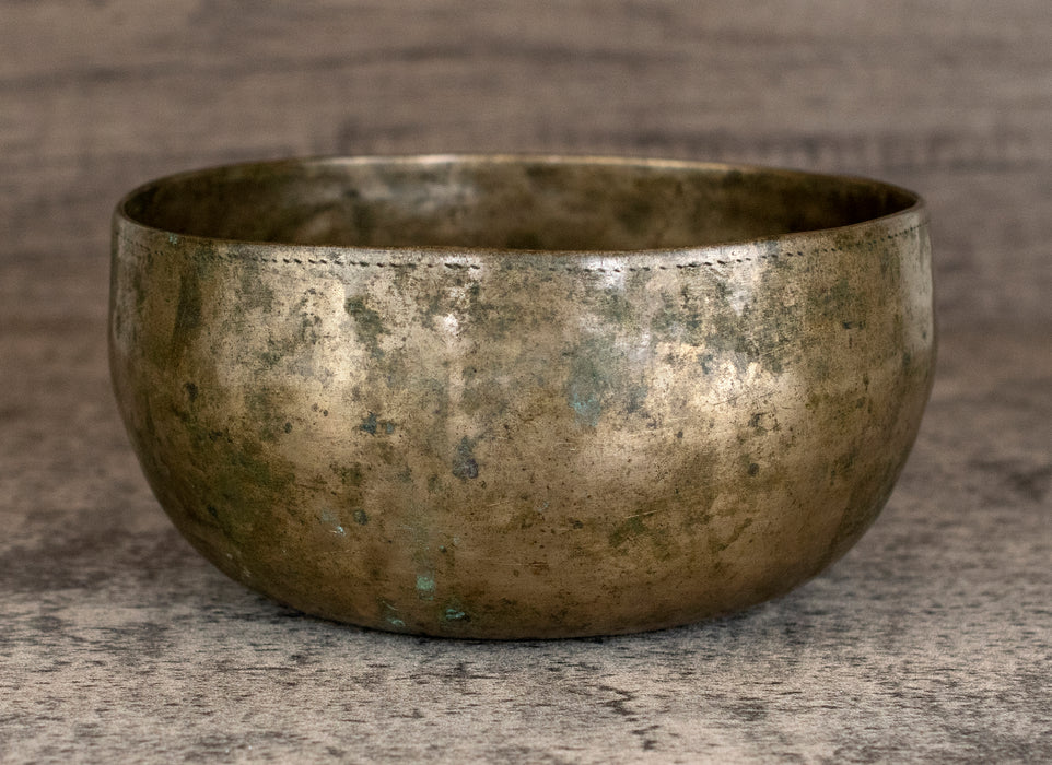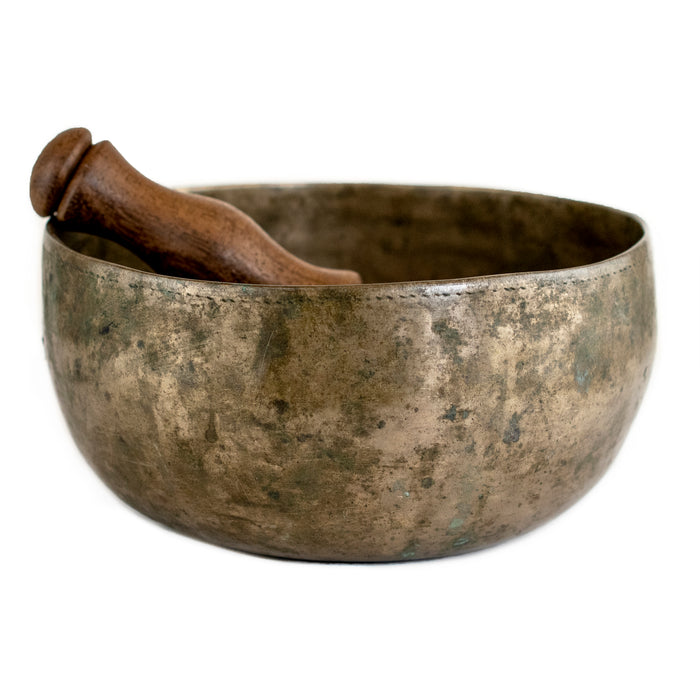 Introducing a beautiful antique thadobati singing bowl that has been crafted by skilled artisans from the Himalayan region. This stunning singing bowl is a one-of-a-kind piece that dates back to the early 19th century and has been passed down through generations. Its unique shape makes it a true masterpiece of traditional craftsmanship. The thadobati singing bowl is made from a high-quality bronze alloy and is carefully hand-hammered to produce its beautiful sound. When played, the bowl emits a rich, warm tone that can be felt throughout the body, promoting relaxation and healing. The bowl's rich history and unique sound make it a valuable addition to any collection of musical instruments or antiques. This antique thadobati singing bowl measures approximately , making it the perfect size for use in sound therapy or meditation practices. The bowl also comes with a wooden striker. Whether you are a collector of antiques, a musician, or simply someone who appreciates the beauty and healing power of sound, this antique thadobati singing bowl is sure to delight and inspire. Don't miss your chance to own a piece of history and experience the magic of this extraordinary musical instrument.