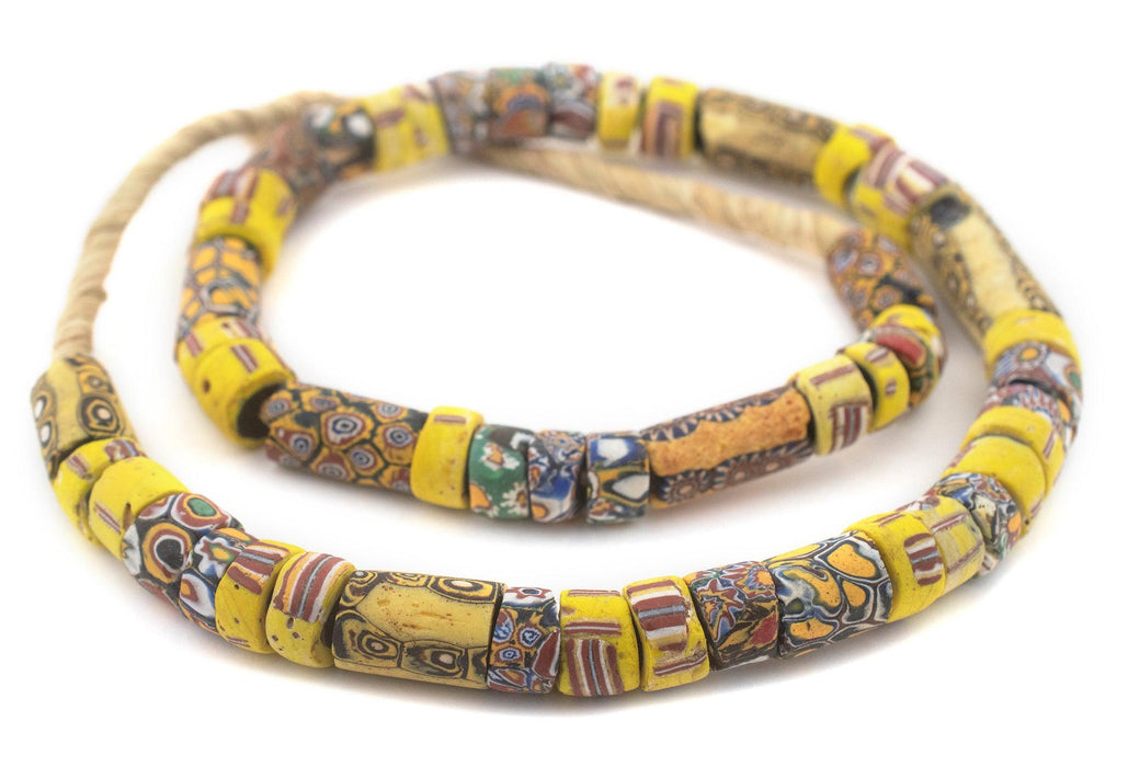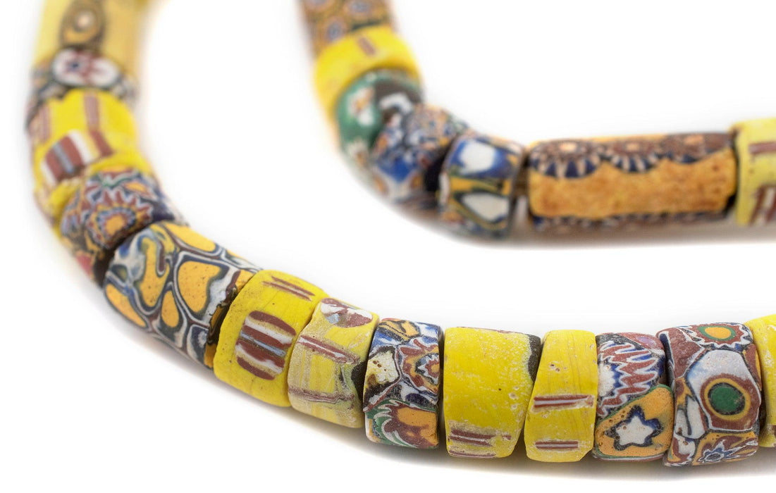 Take a look at this beautiful antique strand of Venetian Millefiori trade beads! Celebrated among the most distinctive of beads, the Millefiori has become nearly synonymous with the West African Trade. Made from famed Murano glass, Millefiori beads derive their name from the Italian words for “Thousand Flowers” due to the characteristic floral motifs that decorate their surface. Millefiori beads were made throughout the 19th and 20th century primarily for export to Africa. Today they are found in many countries including Ivory Coast, Nigeria, and Ghana where they are also known by their Ashanti name “Chachasao”. Most beads are commonly cylindrical in shape but other varieties exist including rectangular, oval, and sometimes even hexagonal beads. You will receive the exact strand pictured. Measurements are approximations.