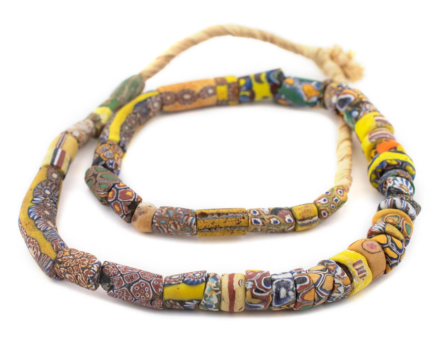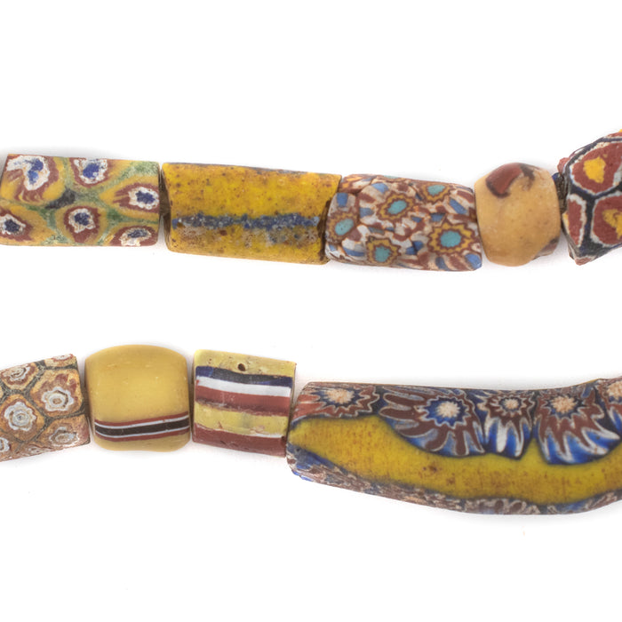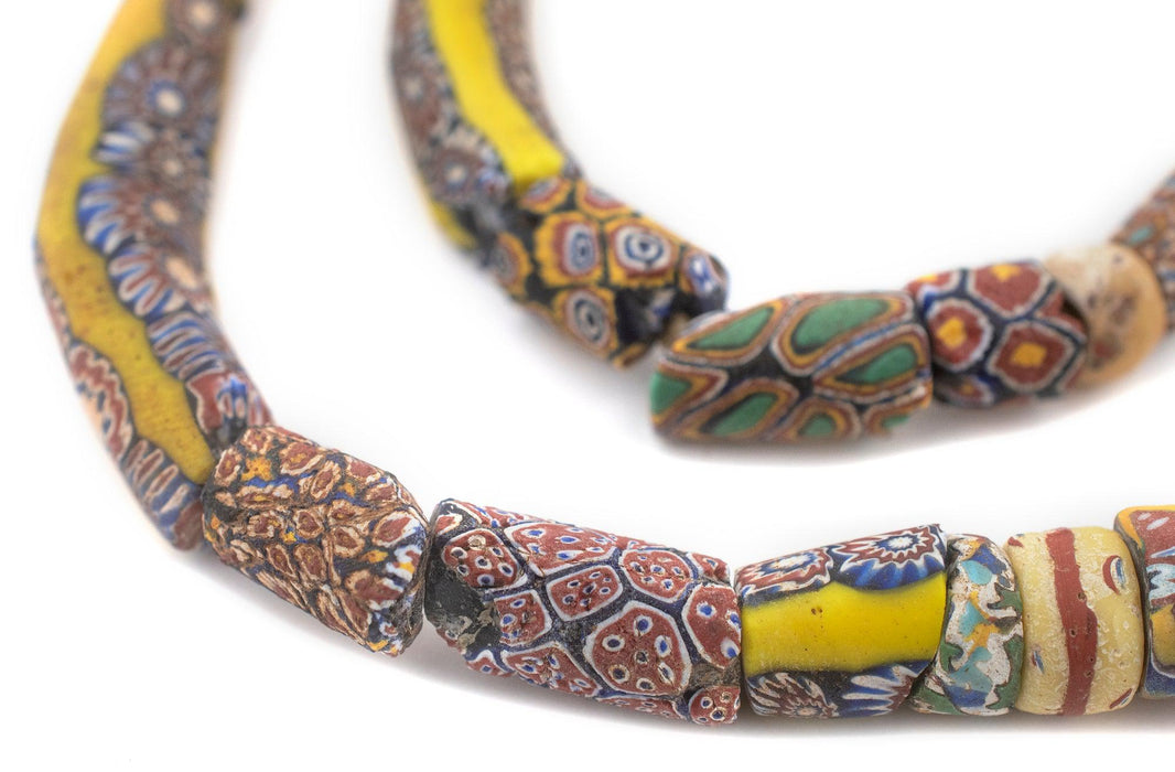 Take a look at this beautiful antique strand of Venetian Millefiori trade beads! Celebrated among the most distinctive of beads, the Millefiori has become nearly synonymous with the West African Trade. Made from famed Murano glass, Millefiori beads derive their name from the Italian words for “Thousand Flowers” due to the characteristic floral motifs that decorate their surface. Millefiori beads were made throughout the 19th and 20th century primarily for export to Africa. Today they are found in many countries including Ivory Coast, Nigeria, and Ghana where they are also known by their Ashanti name “Chachasao”. Most beads are commonly cylindrical in shape but other varieties exist including rectangular, oval, and sometimes even hexagonal beads. You will receive the exact strand pictured. Measurements are approximations.