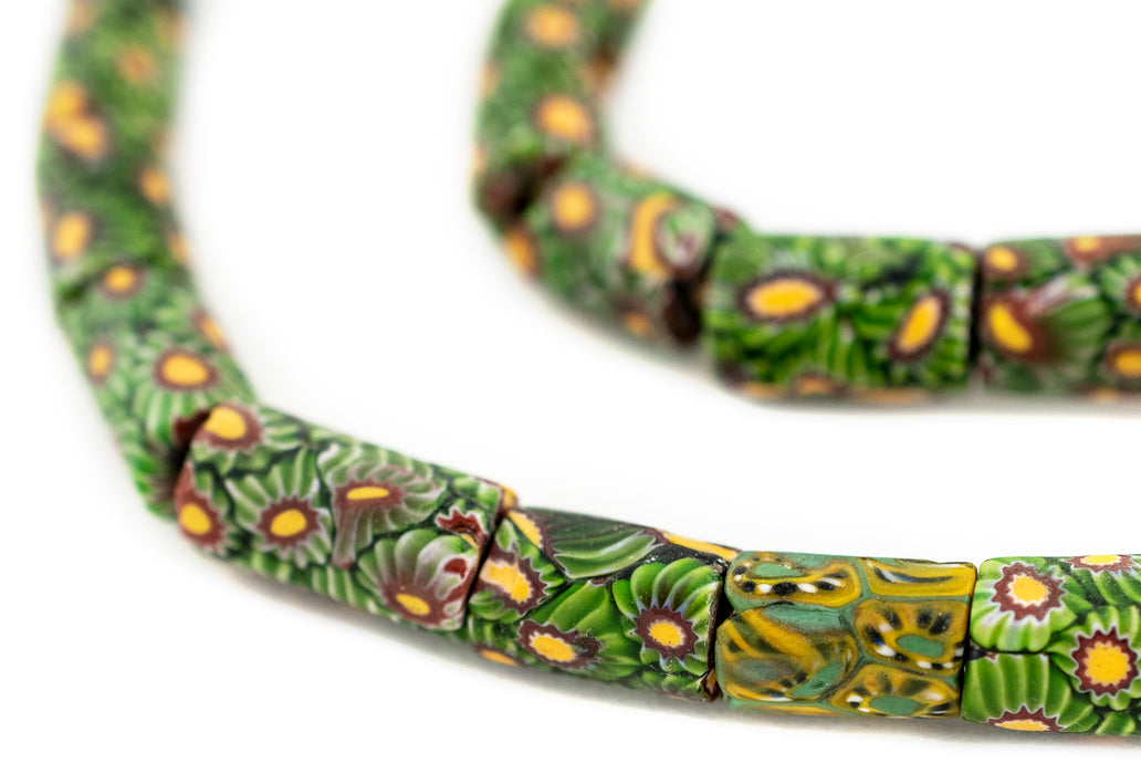 Take a look at this beautiful antique strand of Venetian Millefiori trade beads! Celebrated among the most distinctive of beads, the Millefiori has become nearly synonymous with the West African Trade. Made from famed Murano glass, Millefiori beads derive their name from the Italian words for “Thousand Flowers” due to the characteristic floral motifs that decorate their surface. Millefiori beads were made throughout the 19th and 20th century primarily for export to Africa. Today they are found in many countries including Ivory Coast, Nigeria, and Ghana where they are also known by their Ashanti name “Chachasao”. Most beads are commonly cylindrical in shape but other varieties exist including rectangular, oval, and sometimes even hexagonal beads. You will receive the exact strand pictured. Measurements are approximations.