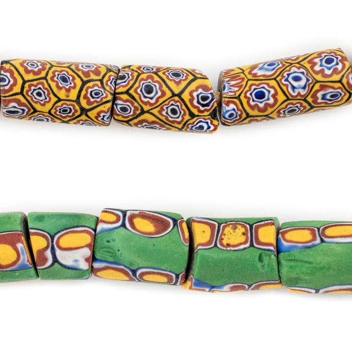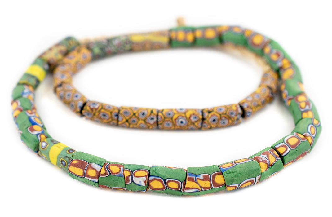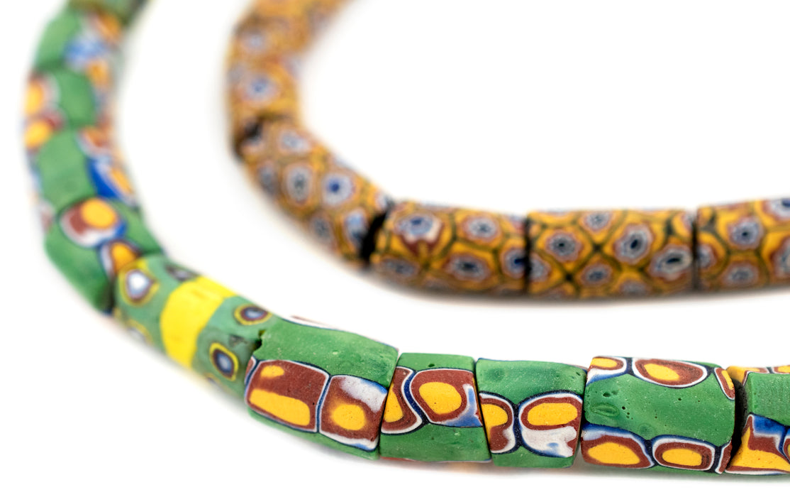 Take a look at this beautiful antique strand of Venetian Millefiori trade beads! Celebrated among the most distinctive of beads, the Millefiori has become nearly synonymous with the West African Trade. Made from famed Murano glass, Millefiori beads derive their name from the Italian words for “Thousand Flowers” due to the characteristic floral motifs that decorate their surface. Millefiori beads were made throughout the 19th and 20th century primarily for export to Africa. Today they are found in many countries including Ivory Coast, Nigeria, and Ghana where they are also known by their Ashanti name “Chachasao”. Most beads are commonly cylindrical in shape but other varieties exist including rectangular, oval, and sometimes even hexagonal beads. You will receive the exact strand pictured. Measurements are approximations.