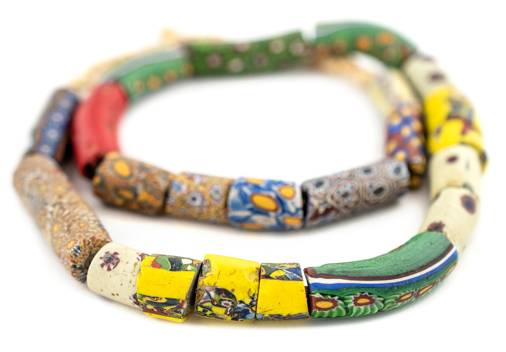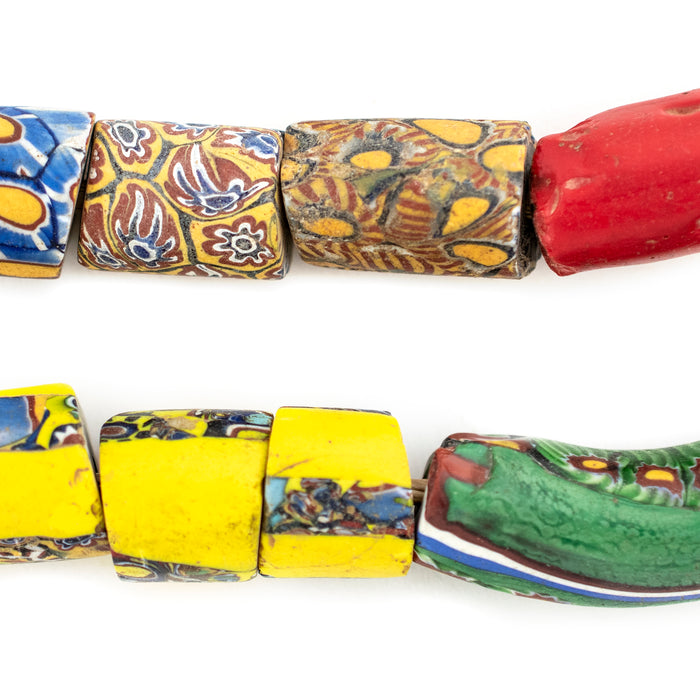 Take a look at this beautiful antique strand of Venetian Millefiori trade beads! Celebrated among the most distinctive of beads, the Millefiori has become nearly synonymous with the West African Trade. Made from famed Murano glass, Millefiori beads derive their name from the Italian words for “Thousand Flowers” due to the characteristic floral motifs that decorate their surface. Millefiori beads were made throughout the 19th and 20th century primarily for export to Africa. Today they are found in many countries including Ivory Coast, Nigeria, and Ghana where they are also known by their Ashanti name “Chachasao”. Most beads are commonly cylindrical in shape but other varieties exist including rectangular, oval, and sometimes even hexagonal beads. You will receive the exact strand pictured. Measurements are approximations.