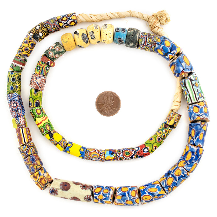 Take a look at this beautiful antique strand of Venetian Millefiori trade beads! Celebrated among the most distinctive of beads, the Millefiori has become nearly synonymous with the West African Trade. Made from famed Murano glass, Millefiori beads derive their name from the Italian words for “Thousand Flowers” due to the characteristic floral motifs that decorate their surface. Millefiori beads were made throughout the 19th and 20th century primarily for export to Africa. Today they are found in many countries including Ivory Coast, Nigeria, and Ghana where they are also known by their Ashanti name “Chachasao”. Most beads are commonly cylindrical in shape but other varieties exist including rectangular, oval, and sometimes even hexagonal beads. You will receive the exact strand pictured. Measurements are approximations.