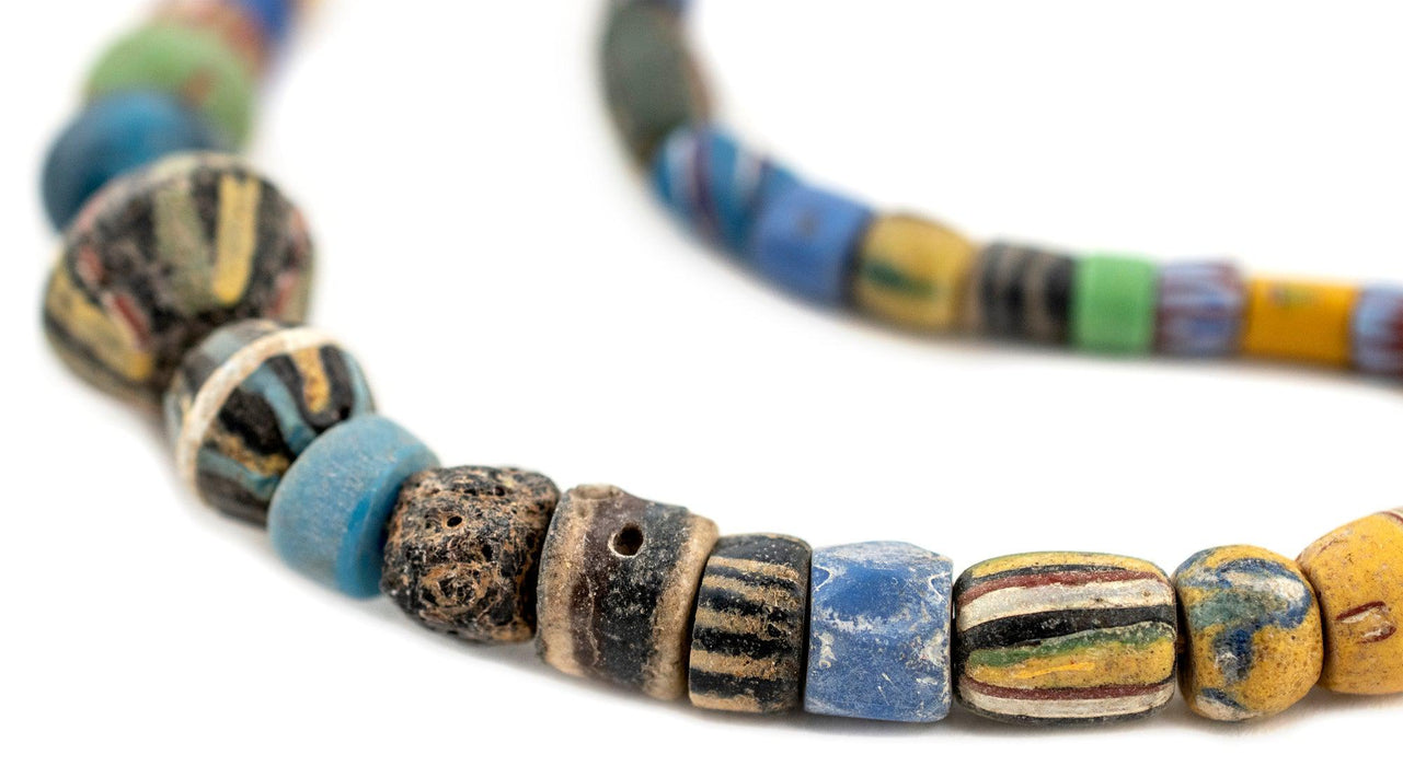 Take a look at this beautiful antique strand of Venetian Millefiori trade beads! Celebrated among the most distinctive of beads, the Millefiori has become nearly synonymous with the West African Trade. Made from famed Murano glass, Millefiori beads derive their name from the Italian words for “Thousand Flowers” due to the characteristic floral motifs that decorate their surface. Millefiori beads were made throughout the 19th and 20th century primarily for export to Africa. Today they are found in many countries including Ivory Coast, Nigeria, and Ghana where they are also known by their Ashanti name “Chachasao”. Most beads are commonly cylindrical in shape but other varieties exist including rectangular, oval, and sometimes even hexagonal beads. You will receive the exact strand pictured. Measurements are approximations.