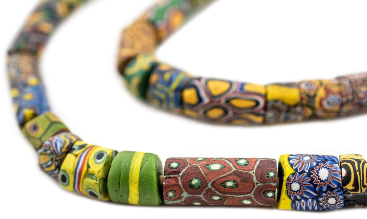 Take a look at this beautiful antique strand of Venetian Millefiori trade beads! Celebrated among the most distinctive of beads, the Millefiori has become nearly synonymous with the West African Trade. Made from famed Murano glass, Millefiori beads derive their name from the Italian words for “Thousand Flowers” due to the characteristic floral motifs that decorate their surface. Millefiori beads were made throughout the 19th and 20th century primarily for export to Africa. Today they are found in many countries including Ivory Coast, Nigeria, and Ghana where they are also known by their Ashanti name “Chachasao”. Most beads are commonly cylindrical in shape but other varieties exist including rectangular, oval, and sometimes even hexagonal beads. You will receive the exact strand pictured. Measurements are approximations.