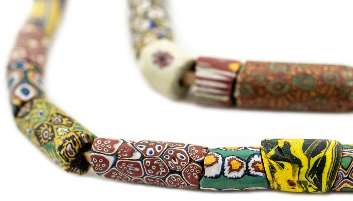 Take a look at this beautiful antique strand of Venetian Millefiori trade beads! Celebrated among the most distinctive of beads, the Millefiori has become nearly synonymous with the West African Trade. Made from famed Murano glass, Millefiori beads derive their name from the Italian words for “Thousand Flowers” due to the characteristic floral motifs that decorate their surface. Millefiori beads were made throughout the 19th and 20th century primarily for export to Africa. Today they are found in many countries including Ivory Coast, Nigeria, and Ghana where they are also known by their Ashanti name “Chachasao”. Most beads are commonly cylindrical in shape but other varieties exist including rectangular, oval, and sometimes even hexagonal beads. You will receive the exact strand pictured. Measurements are approximations.