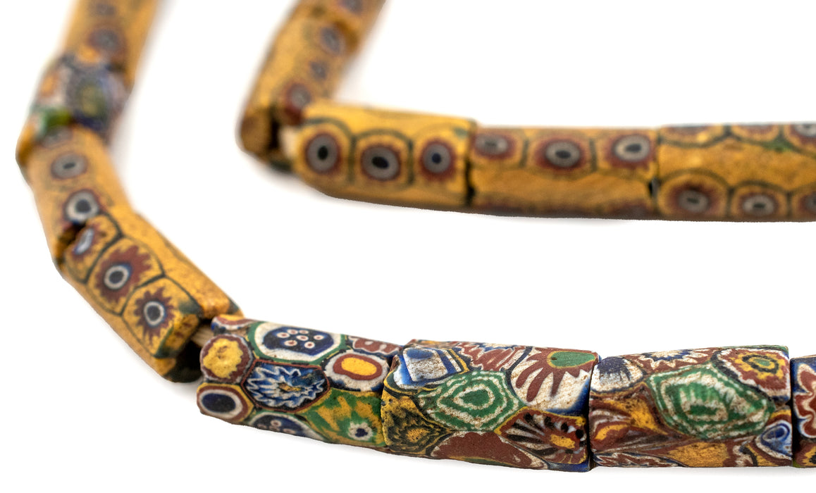 Take a look at this beautiful antique strand of Venetian Millefiori trade beads! Celebrated among the most distinctive of beads, the Millefiori has become nearly synonymous with the West African Trade. Made from famed Murano glass, Millefiori beads derive their name from the Italian words for “Thousand Flowers” due to the characteristic floral motifs that decorate their surface. Millefiori beads were made throughout the 19th and 20th century primarily for export to Africa. Today they are found in many countries including Ivory Coast, Nigeria, and Ghana where they are also known by their Ashanti name “Chachasao”. Most beads are commonly cylindrical in shape but other varieties exist including rectangular, oval, and sometimes even hexagonal beads. You will receive the exact strand pictured. Measurements are approximations.
