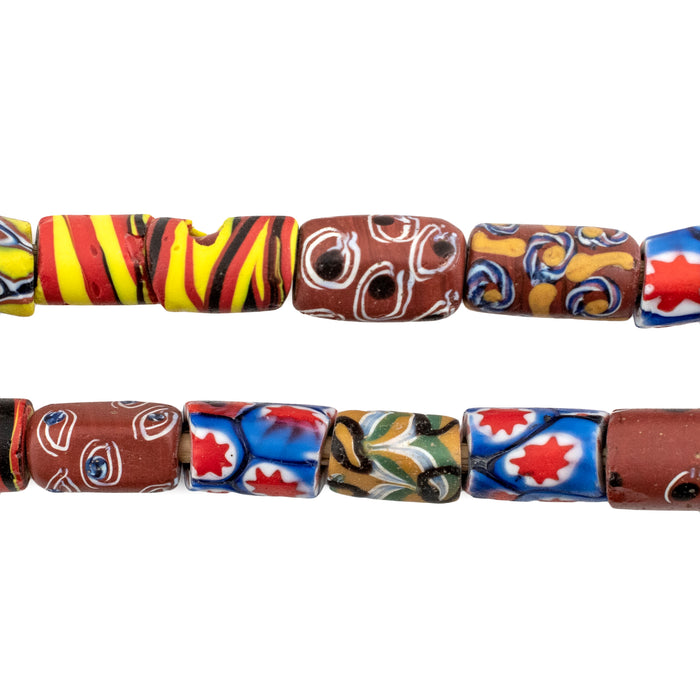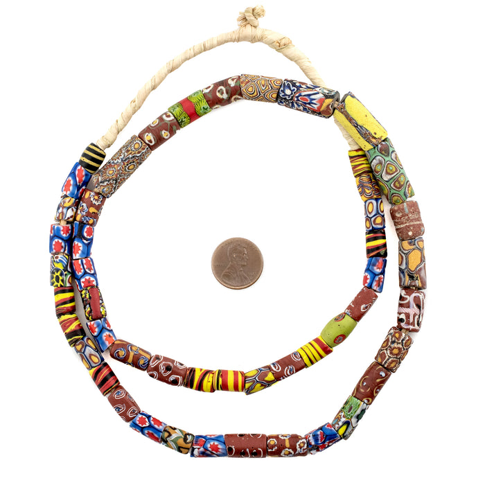 Take a look at this beautiful antique strand of Venetian Millefiori trade beads! Celebrated among the most distinctive of beads, the Millefiori has become nearly synonymous with the West African Trade. Made from famed Murano glass, Millefiori beads derive their name from the Italian words for “Thousand Flowers” due to the characteristic floral motifs that decorate their surface. Millefiori beads were made throughout the 19th and 20th century primarily for export to Africa. Today they are found in many countries including Ivory Coast, Nigeria, and Ghana where they are also known by their Ashanti name “Chachasao”. Most beads are commonly cylindrical in shape but other varieties exist including rectangular, oval, and sometimes even hexagonal beads. You will receive the exact strand pictured. Measurements are approximations.