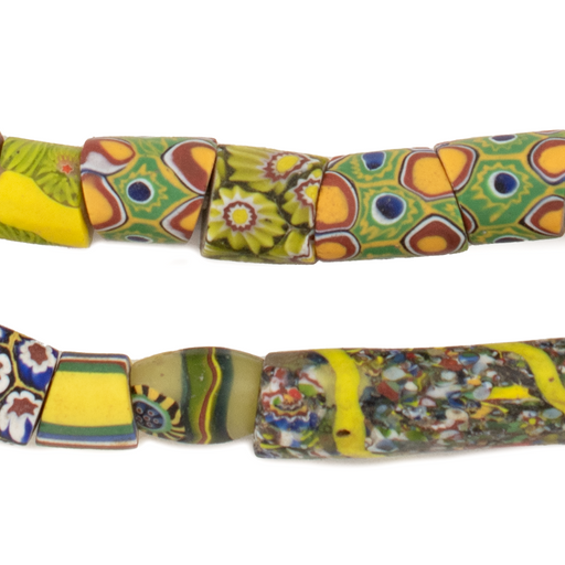 Take a look at this beautiful antique strand of Venetian Millefiori trade beads! Celebrated among the most distinctive of beads, the Millefiori has become nearly synonymous with the West African Trade. Made from famed Murano glass, Millefiori beads derive their name from the Italian words for “Thousand Flowers” due to the characteristic floral motifs that decorate their surface. Millefiori beads were made throughout the 19th and 20th century primarily for export to Africa. Today they are found in many countries including Ivory Coast, Nigeria, and Ghana where they are also known by their Ashanti name “Chachasao”. Most beads are commonly cylindrical in shape but other varieties exist including rectangular, oval, and sometimes even hexagonal beads. You will receive the exact strand pictured. Measurements are approximations.