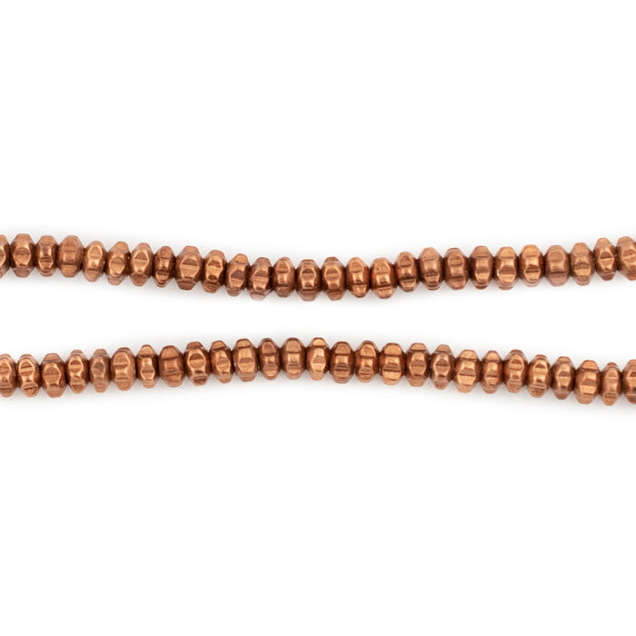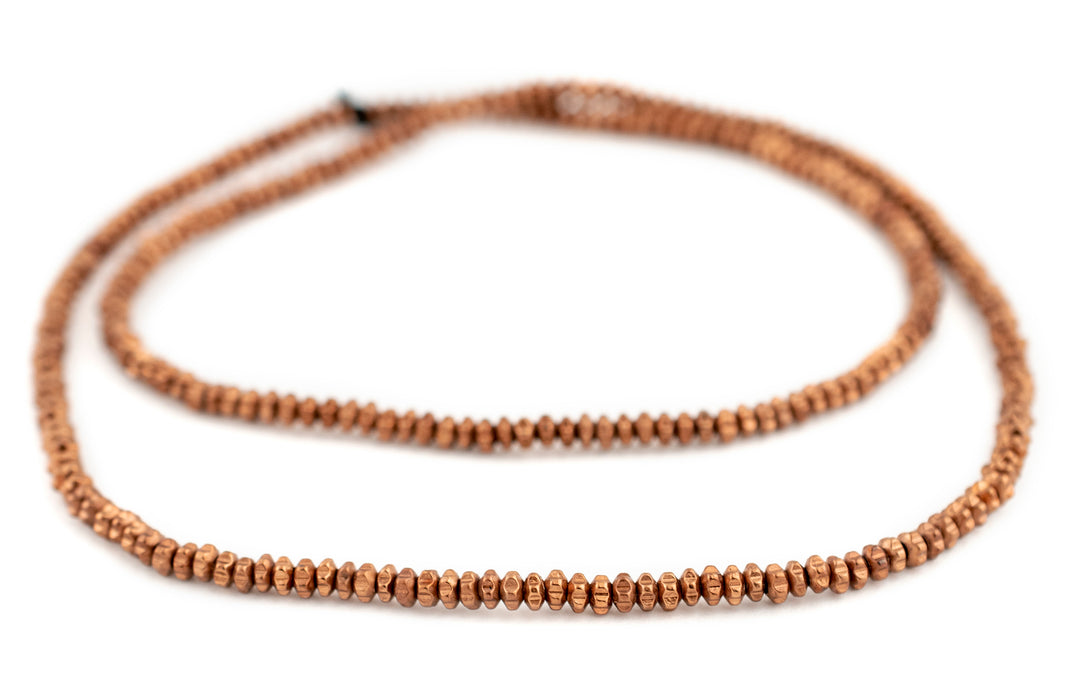 Take a look at these handcrafted antique copper metal beads. Each artisan strand measures in at approximately 24" in length. Each bead is about 2 x 4mm in size and roughly has a 1.5mm sized stringing hole. These metallic antique copper beads make for excellent spacers and accent pieces in most jewelry designs. Multiple strands pictured. Each strand sold individually. With so many practical uses you really can't go wrong with these metal beads! This artisan product is made using premium copper electroplating over brass to make these copper finish customer favorites.