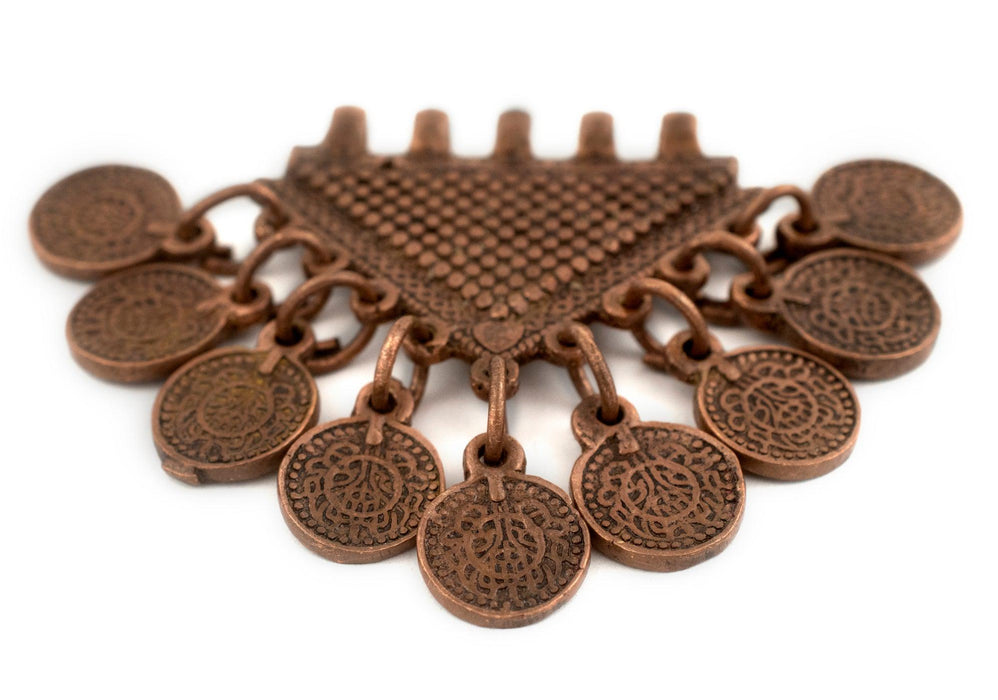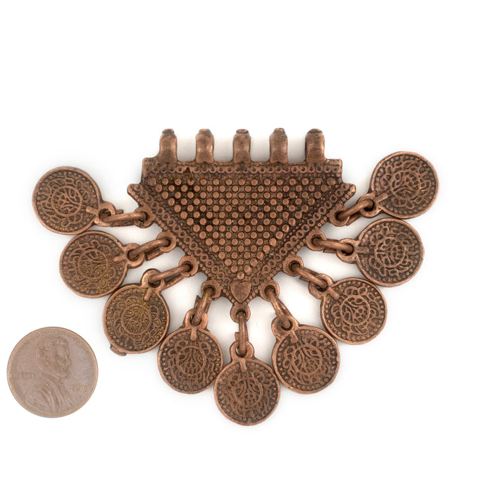 Take a look at this special tribal pendant crafted with coin style charms. The pendant measures approximately 55 x 45mm in size, with a hole size of 1mm. Available in a variety of colors. Get yours today! This artisan product is made using premium copper electroplating over brass to make these copper finish customer favorites.