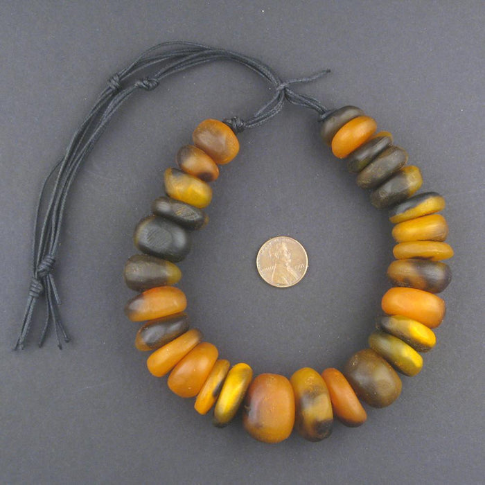 These apricot colored swirl patterned beads are made in Morocco from recycled sheep horn. The vibrant colors are sure to make your jewelry a statement. Bead sizes range from 6-18mm wide to 17-23mm diameter. Each strand is unique and may vary slightly from strand pictured.