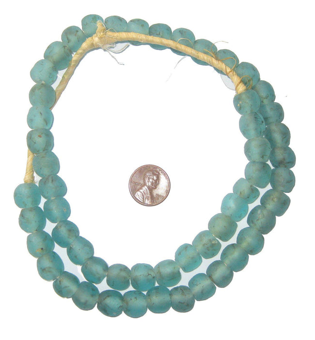 Beautiful strand of ghana recycled glass beads in aqua black swirl color. Recycled glass beads are a type of indigenously produced African bead from Ghana West Africa. These beautiful recycled beads are made using an old method that has been used for centuries. The glass itself is derived from a variety of recycled sources including old beverage and medicine bottles. The procedure for making the beads consists of a number of steps whereby powdered glass is poured into molds of clay and baked in a specialized oven. These beads are produced in large part by the Krobo tribe and through recycling glass are environmentally friendly.