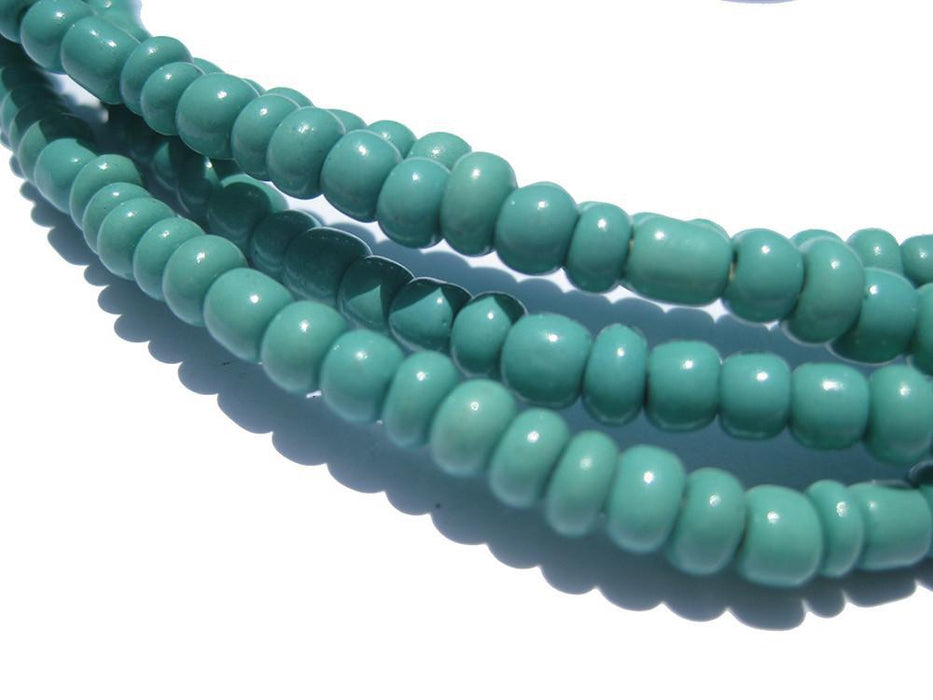 Two strands of aqua small glass beads from Africa. Each bead measures approximately 4mm in diameter by 3mm in length. Some variation in individual beads as shown pictured.