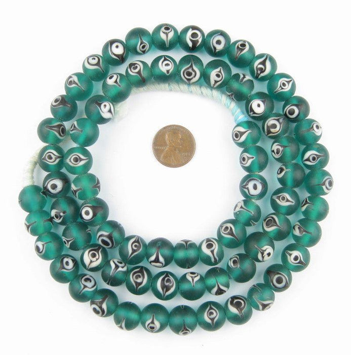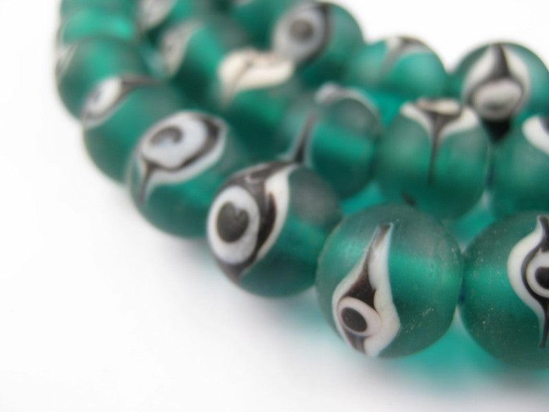Admire this exceptional strand of aqua glass eye beads. The quality of the workmanship is apparent from the detail of each eye pattern. Eye beads such as these have been worn and trade for centuries by the peoples of Africa and the Middle East. This long strand measures 35 inches with approximately 70 beads of 12mm diameter size. The strand has been nicely finished with string at the top end so it could be worn as is or cut to include in your unique jewelry designs. Each strand is unique and may vary slightly from the pictured strand.