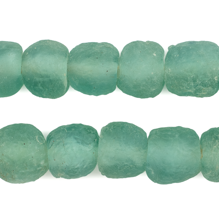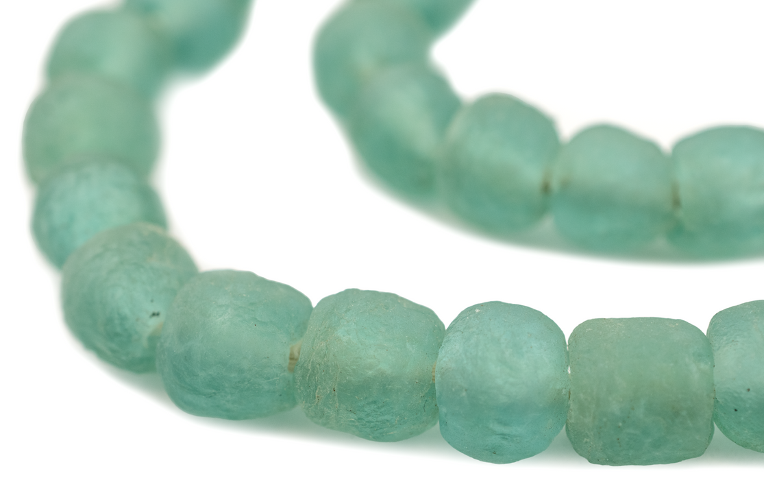 Recycled glass beads are a type of indigenously produced African bead from Ghana West Africa. These beautiful blue color recycled beads are made using an old method that has been used for centuries. The glass itself is derived from a variety of recycled sources including old beverage and medicine bottles. The procedure for making the beads consists of a number of steps whereby powdered glass is poured into molds of clay and baked in a specialized oven. These beads are produced in large part by the Krobo tribe and through recycling glass are environmentally friendly. Each bead measures approximately 12-13 x 14-15mm, with a hole size of approximately 2-3mm. You will receive one strand measuring approximately 24". There are around 39 beads on each strand. Grab a strand or two for yourself today!