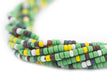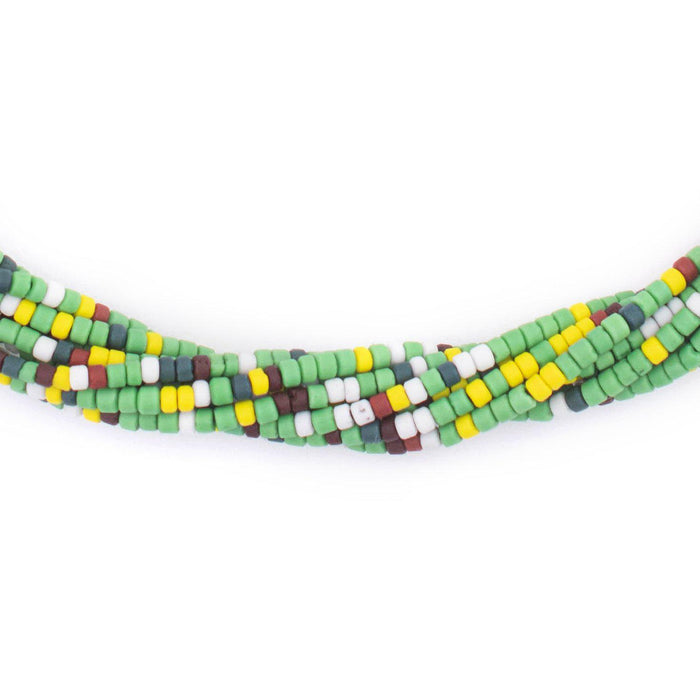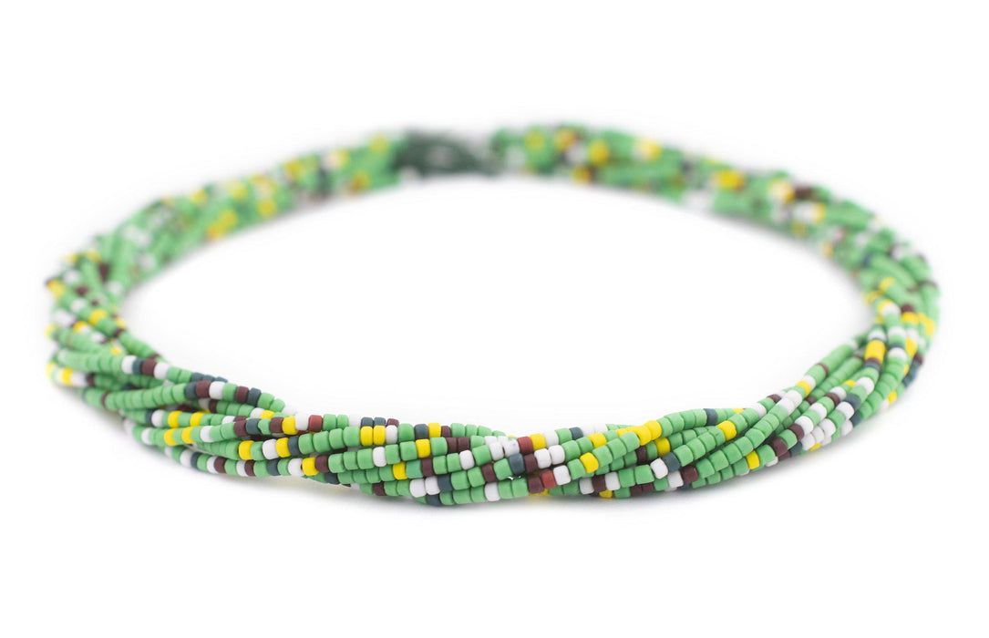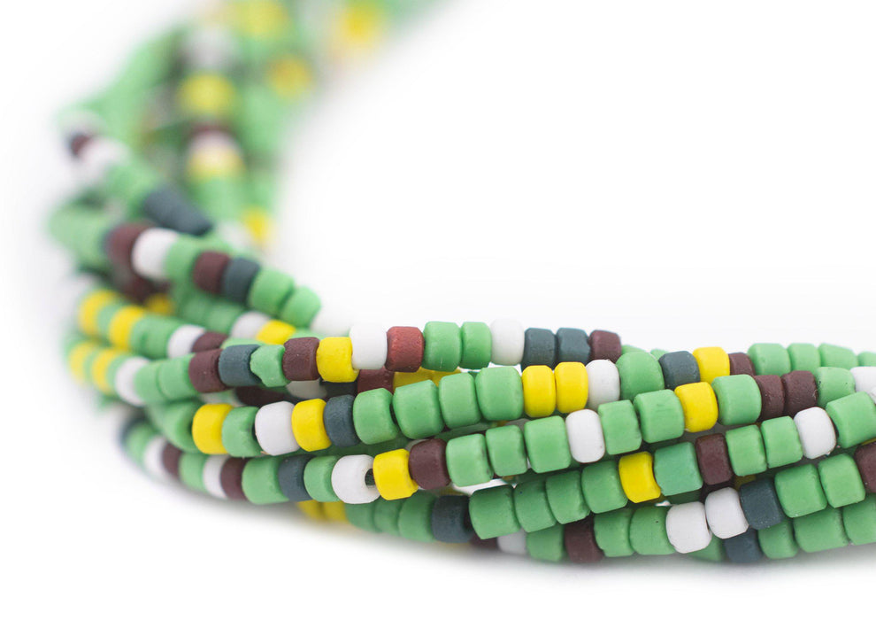 Beautiful set of 10 strands of green and other colors of tiny glass seed beads from Afghanistan. These beads measure 1.5 x 2mm, with a hole size of less than 1mm. Handmade in a village not far from the Afghan-Pakistan border, these small treasures are fruition of a timeless tradition of bead-making that dates back centuries. Multiple strands pictured. Sold in sets of 10 strands. Shade of green and reddish brown as well as well as ratio of colors may vary slightly from photo.