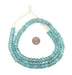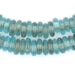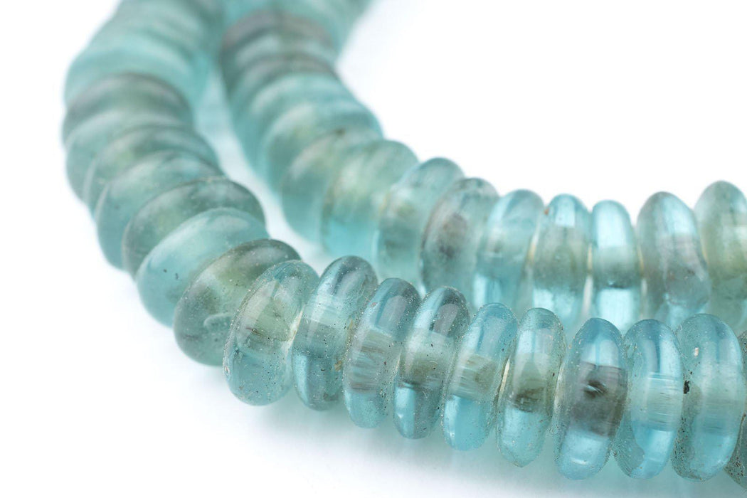 Take a look at these beautiful rondelle shaped recycled glass beads. Powder glass beads are made by crushing glass to a fine powder and heating it so that the particles fuse together. The glass is then poured into clay molds, with a cassava leaf stem used to make the hole. They are baked in an oven and the glass fuses and the cassava stem burns up. This technique has been used in Africa for centuries. Some strands may not have raffia. Please inquire in advance if required.