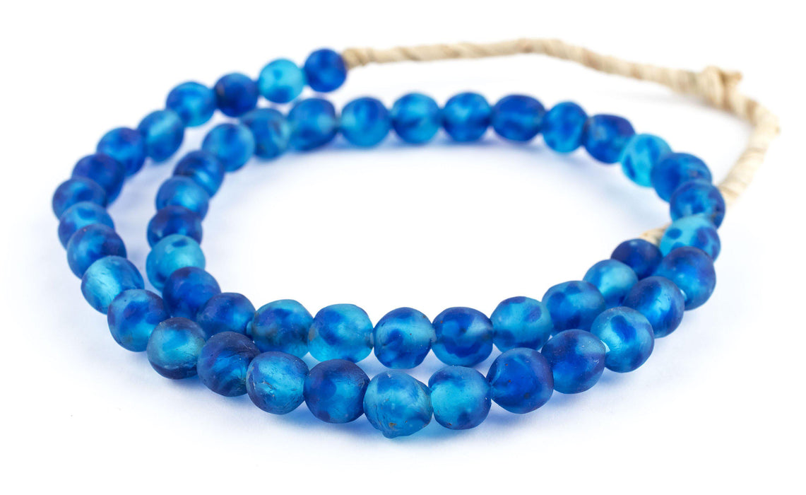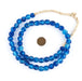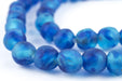 Recycled glass beads are a type of indigenously produced African bead from Ghana West Africa. These beautiful blue color recycled beads are made using an old method that has been used for centuries. The glass itself is derived from a variety of recycled sources including old beverage and medicine bottles. The procedure for making the beads consists of a number of steps whereby powdered glass is poured into molds of clay and baked in a specialized oven. These beads are produced in large part by the Krobo tribe and through recycling glass are environmentally friendly.