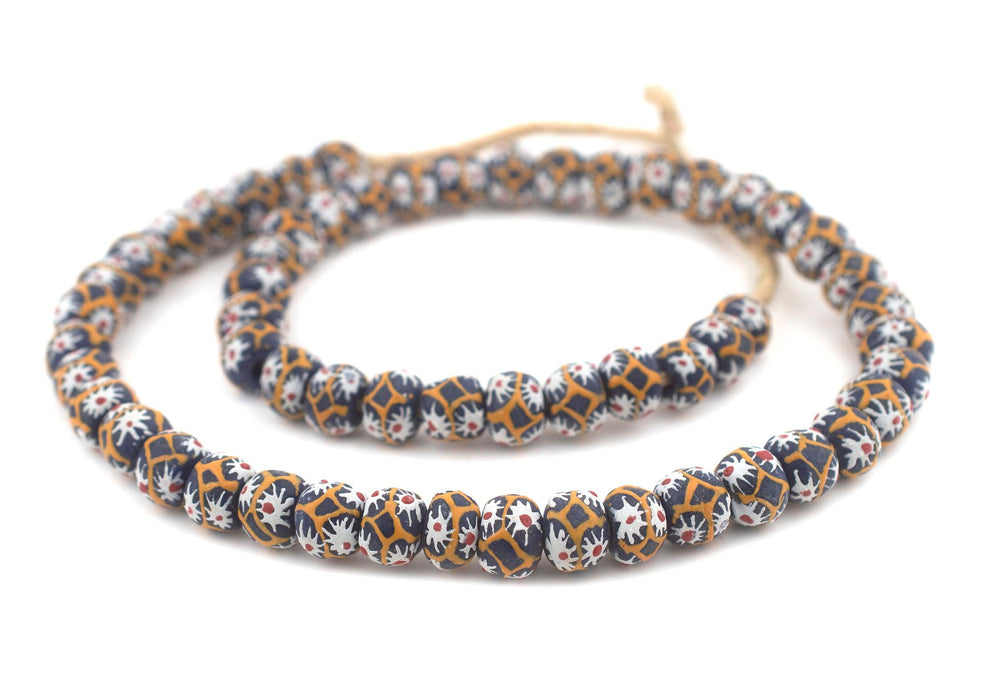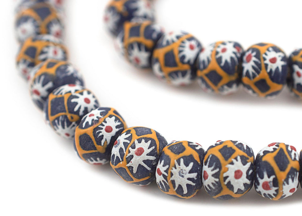 This beautiful strand of African powder glass beads was made by the people of Krobo Mountain in Ghana, West Africa. Many designs of Krobo beads are patterned to resemble old Venetian fancy trade beads. They are made from bottles and other glass items that are turned into powder, then poured into molds in order to create beads. Decorations on the beads are made with a paste made of colored glass powder and water which is applied by hand using a thin wooden stalk. The beads are cooked a second time to fix the decor. Each bead measures approximately 9-10 x 12mm with a hole size of approximately 3-4mm. You will receive a full strand measuring approximately 26". Limited supply.