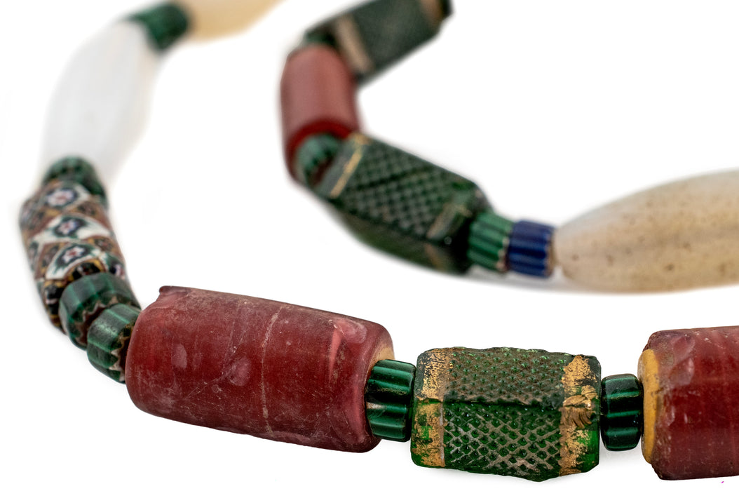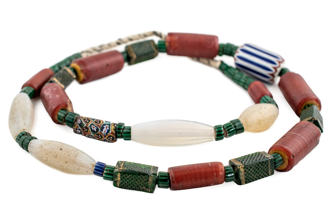 What a strand! This unique medley of includes a collection of color coordinated beads including a Millefiori Bead, Old Cylindrical Cornaline D'Aleppo White Heart Beads, a large Venetian Chevron, green Watermelon Chevron spacers, Elongated Czech Glass Beads, and a rare variety of rectangular Vaseline Bead with gold finish. Most bead vary in size between 10-29 x 10-18mm diameter on a 30" strand. You will receive the exact strand pictured. Only one available!