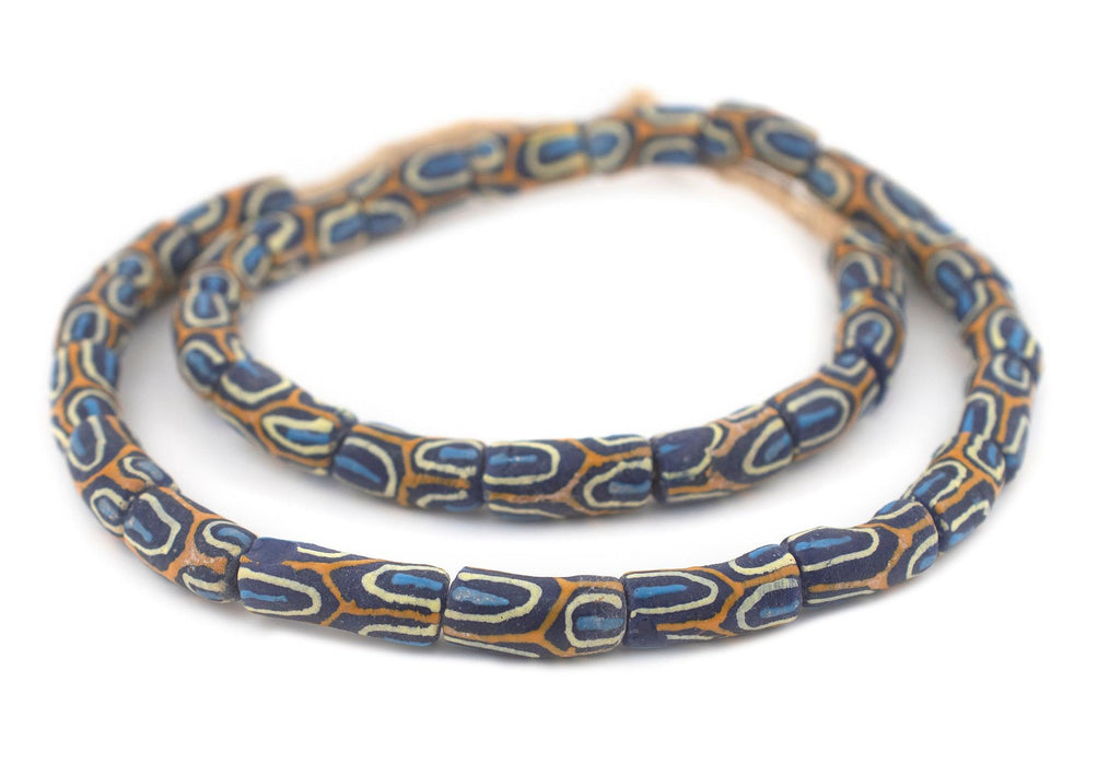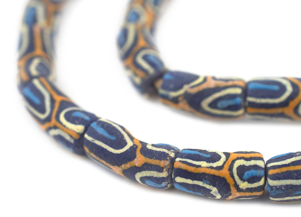 This beautiful strand of African powder glass beads was made by the people of Krobo Mountain in Ghana, West Africa. Many designs of Krobo beads are patterned to resemble old Venetian fancy trade beads. They are made from bottles and other glass items that are turned into powder, then poured into molds in order to create beads. Decorations on the beads are made with a paste made of colored glass powder and water which is applied by hand using a thin wooden stalk. The beads are cooked a second time to fix the decor. Each bead measures approximately 20-24 x 10-11mm with a hole size of approximately 3-4mm. You will receive a full strand measuring approximately 29". Limited supply.